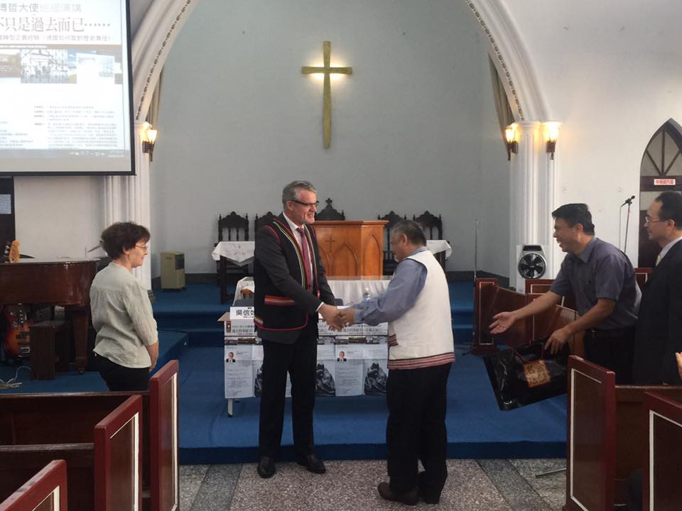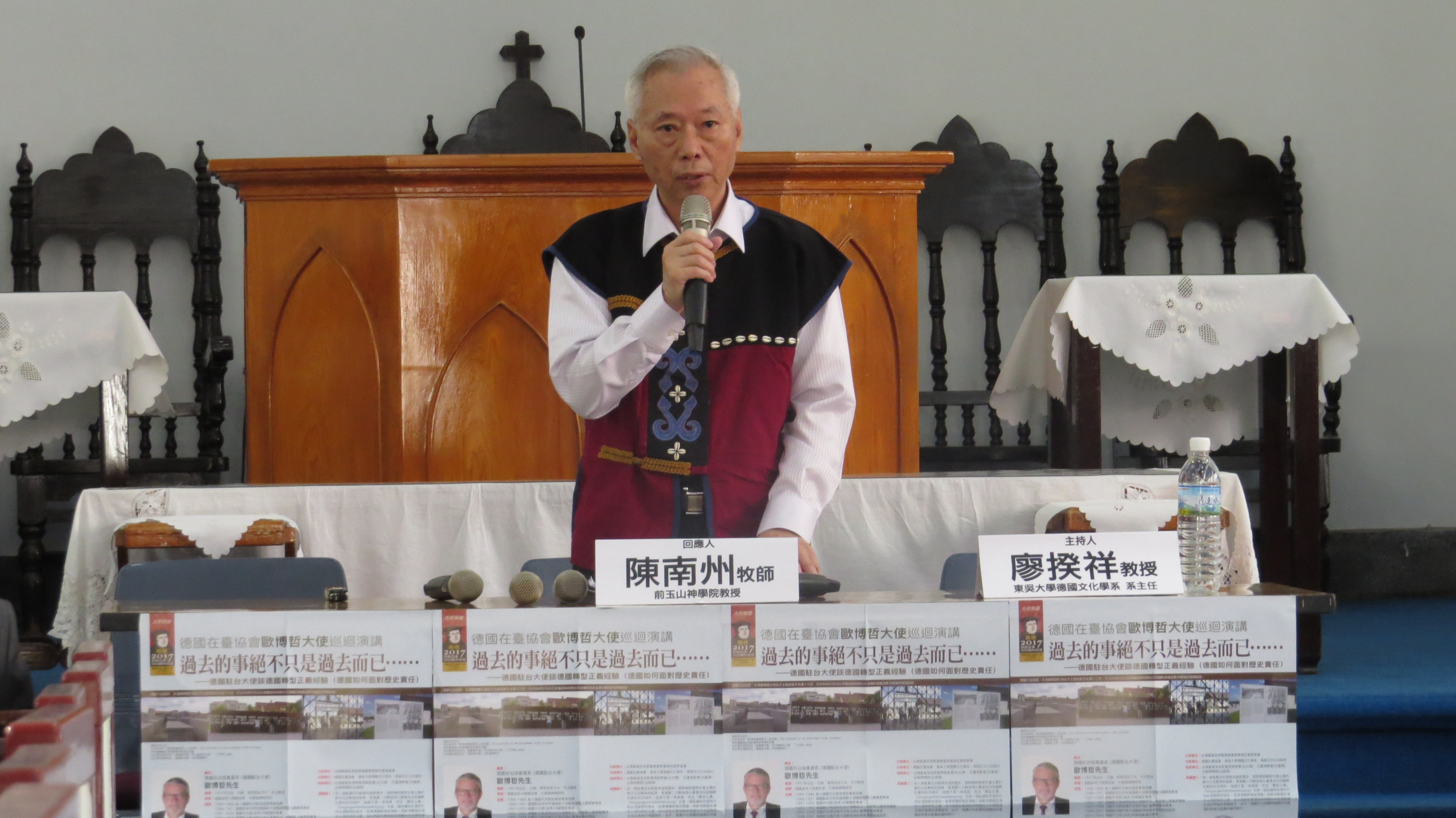 總會議長Sudu Tada牧師贈送原住民條紋背心給歐博哲大使夫婦(林佳靜攝) 此次花蓮場的演講,由東吳大學德國文化學系系主任廖揆祥教授負責主持,南與北文化出版社社長吳信如翻譯,並由前玉山神學院教授陳南州牧師及台灣基督長老教會原住民教社幹事歐蜜‧偉浪牧師擔任回應人。會前,總會議長Sudu Tada牧師代表PCT贈送原住民背心給大使夫婦。 歐博哲表示,台灣與德國都是出口導向、發展高科技與注重經濟發展的國家,彼此是非常重要的商業夥伴,特別是在民主、人權及民主自由的意見表達上有共同的價值觀。 歐博哲說,回憶猶太人的大屠殺,對於德國人來說是心痛的歷程,必須「克服過去」,才能夠邁向未來。他說,很多人希望趕快回到生活正軌,想要忘記過去,只要往前看就好,但這是錯誤的觀念。克服過去,是每個世代的任務,無法一次解決。 他從四方面來談德國轉型正義的過程:(一)二次大戰後,德國如何面對納粹時代所犯罪行的問題;(二)東德政權垮台後,面對非法治國家所遺留下的問題。(三)兩次的轉型正義對德國所產生的影響。(四)在兩次克服過去的過程中,也產生了被工具化的問題。 歐博哲強調,德國的轉型正義,在人類歷史中是獨一無二的經驗,無法被複製和轉移。他認為,每個國家社會必須找到自己面對轉型正義的方式。他指出,轉型正義最重要的目的就是「和好」。能使社會的怨恨及敵視逐漸減少,才是有效的。「克服過去」要能成功,必須區分個人罪責及團體的責任。若針對民族集體審判,則會造成新的仇恨產生。他舉例,前東德秘密警察檔案開放後,讓每個人都可以查到告密者的資料,並沒有造成大家的恐懼與懷疑,反而讓社會得到解放及澄清的效果。
