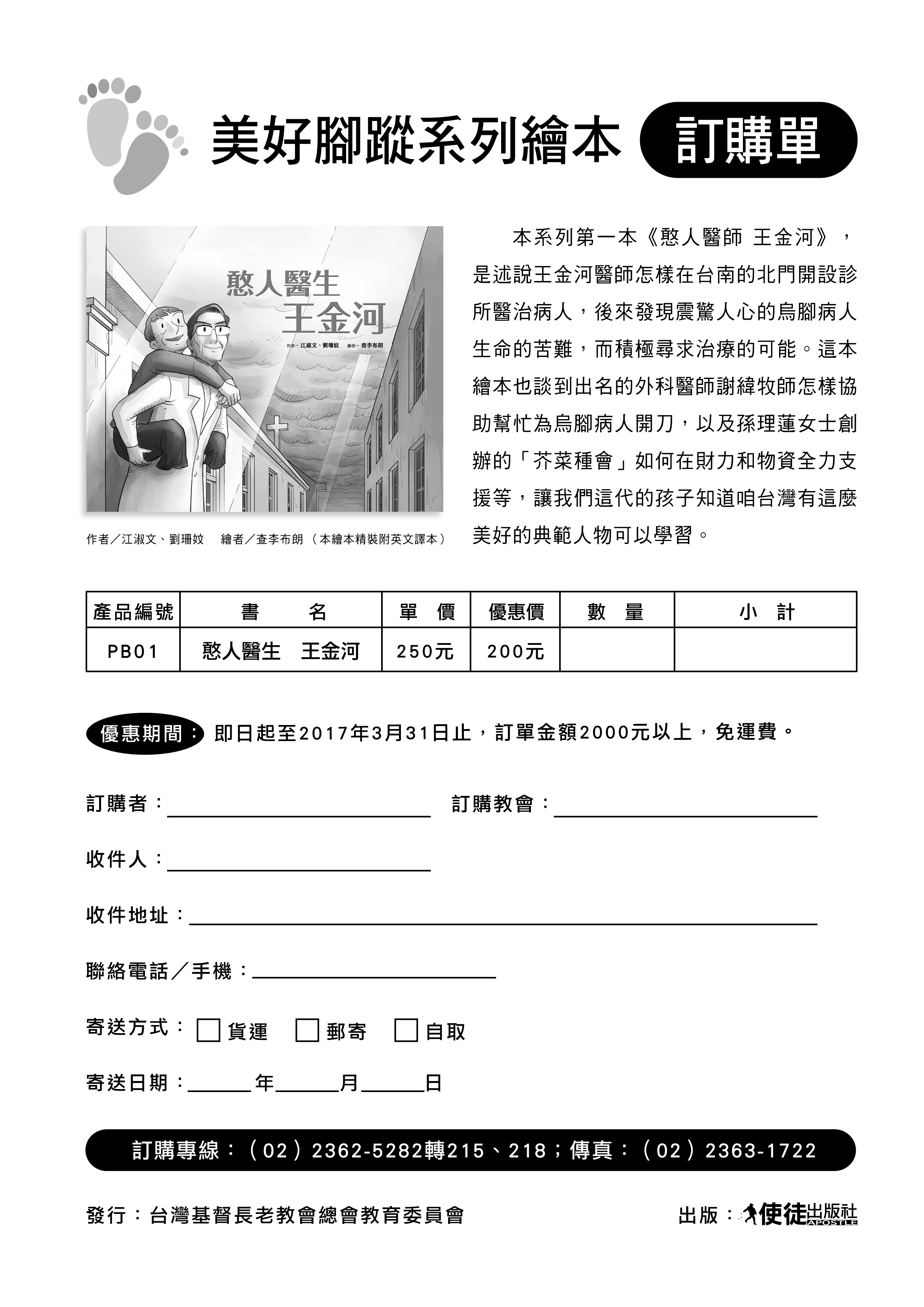 總會教育委員會使徒出版社於2016年12月出版美好腳蹤繪本系列第一本《憨人醫師 王金河》,並在2017年1月8日假中山長老教會舉辦新書發表。發表會中,首先邀請美好腳蹤繪本系列總策畫盧俊義牧師分享本套繪本系列出版的源由。會中貴賓則是邀請王金河醫師兒子王鳳群先生來分享他父親王醫師的愛及服事的事蹟。另有,《憨人醫師 王金河》作者江淑文女士、劉珊妏女士分享創作動機及繪本特色。發表會後也進行簽書活動。 本套繪本的信仰人物是根據長老教會發展的《暑期兒童少年營教材》裡介紹的信仰人物發展而成,《暑期兒童少年營教材》源自盧俊義牧師在台北東門教會帶領會友設計該教會暑期教材,起初先與公報社合作,現今則完全歸屬台灣基督長老教會總會教育委員會負責的教材。該教材最大的特色,就是將聖經的故事,連結到為台灣默默奉獻的人物故事,有些是土生土長的台灣人,有些是飄洋過海來的異鄉人,還有一些台灣人遠赴他國照顧艱苦人。這些人無論來自哪裡、落腳在哪裡,他們所做的事,都是聖經裡教導基督徒應該做的。 本系列第一本《憨人醫師 王金河》,是述說王金河醫師怎樣在台南的北門開設診所醫治病人,後來發現震驚人心的烏腳病人生命的苦難,而積極尋求治療的可能。這本繪本也談到出名的外科醫師謝緯牧師怎樣協助幫忙為烏腳病人開刀,以及孫理蓮女士創辦的「芥菜種會」如何在財力和物資全力支援等,讓我們這代的孩子知道咱台灣有這麼美好的典範人物可以學習。 此外,該系列繪本最大的特色,就是內容淺白易懂,所畫的人事物也非常貼近。以《憨人醫師 王金河》為例,繪者和作者為了真實了解王金河醫師,專程走訪台南王金河紀念館瀏覽很久,並透過實地訪視王醫師的診所、故居,北門嶼長老教會,回來後才著手繪畫及撰寫。繪本還有一個特色,就是在最後設計「親子旅遊」,建議要帶孩子參訪「台灣烏腳病文化紀念園區」,可行的路線,以及整個園區的生態環境。更值得一提的是,將這些兒童繪本的故事翻譯成英文,這樣,旅居國外的台灣人第二、三代子弟,就會知道祖父母、父母的故鄉的故事,進而認同台灣就是他們的祖國,海內外的台灣人都可全家一起閱讀。 美好腳蹤繪本系列後續出版規劃:2017年3月接續出版的第二本繪本《澎湖阿嬤 白寶珠》,她是美國人,在澎湖為痲瘋病人奉獻一生。她晚年的時候,前總統陳水扁就曾代表台灣人民向她表示最高的謝意。2017年到2018年將推出創辦「愛愛寮」的乞丐之父施乾;關心痲瘋病人並創辦「樂生療養院」的戴仁壽醫生;創辦「伊甸基金會」的劉俠女士;引進西方醫療的馬雅各醫生;開啟台灣盲人教育的甘為霖牧師。2018年之後,依序出版:錫質平神父、陳五福醫師、胡文池牧師、孫理蓮師母、李庥牧師、倪安寧女士、八田與一工程師、紀守常神父、陳拱北醫師、范鳳龍醫師、廖繼春教授、侯書德牧師、石仁愛修女、梅監務牧師、井上伊之助醫師、駱先春牧師、陳翠玉女士、謝緯牧師、何義士神父、林媽利女士、曹永和院士、林朝棨教授、羅慧夫醫師、蔡巧女士、范裕熙先生、李鎮源院士、新渡戶稻造、蒲敏道神父、葛玉霞修女、薄柔纜醫師、黃至成醫師、施照子女士。 歡迎訂購 電話:02-23625282 分機 215、218 傳真:02-23621722 地址:台北市羅斯福路三段269巷3號 網址:http://childrensbook.pct.org.tw 劃撥帳戶:使徒出版社有限公司 劃撥帳號:50066252