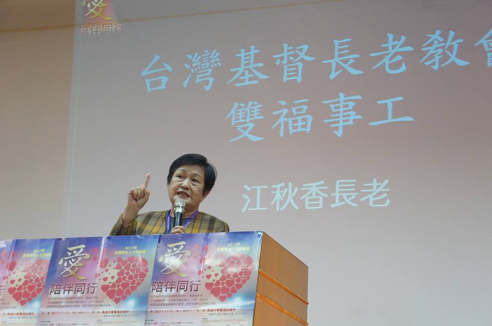 江秋香長老鼓勵教會婦女走進貧窮的社會,幫助社會邊緣人(楊莉玲攝) 江秋香則鼓勵長老教會婦女走出舒適圈,走進貧窮的社會,幫助社會邊緣人。她提到台灣的社會福利工作,包括醫院、身障機構、孤兒院、學校及社服機構,都是由基督教設立的。她也說明台灣基督長老教會目前的社服機構及服務內容,包括台北婦女展業中心、海員、漁民服務中心、身心障礙關懷中心、勞工關懷中心、高雄市岡山身心障礙福利服務中心、平安澎湖辦事處、屏東身心障礙福利服務中心、原住民社區發展中心等。近來政府推動長照2.0(長期照顧十年計畫2.0),江秋香長老鼓勵教會抓住機會,設立關懷據點,走入社區關懷需要幫助的人。