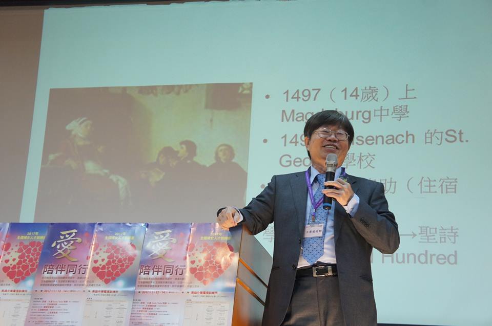 台南神學院院長王崇堯牧師介紹馬丁路德與加爾文的思想脈絡(楊莉玲攝) 王崇堯牧師則介紹馬丁路德與加爾文的思想脈絡,及對台灣基督長老教會的影響。王崇堯指出,路德派的「因信稱義」,需要預定論的配合,重視內在的靈修,以保守恩典不失落。加爾文派則相信恩典不會失落,以行為榮耀上帝,彰顯上帝的揀選。台灣基督長老教會承襲蘇格蘭長老教會的傳統,信徒可以監選自己教會的牧師。他以巴克禮的一生,勉勵信徒要為榮耀上帝而活。