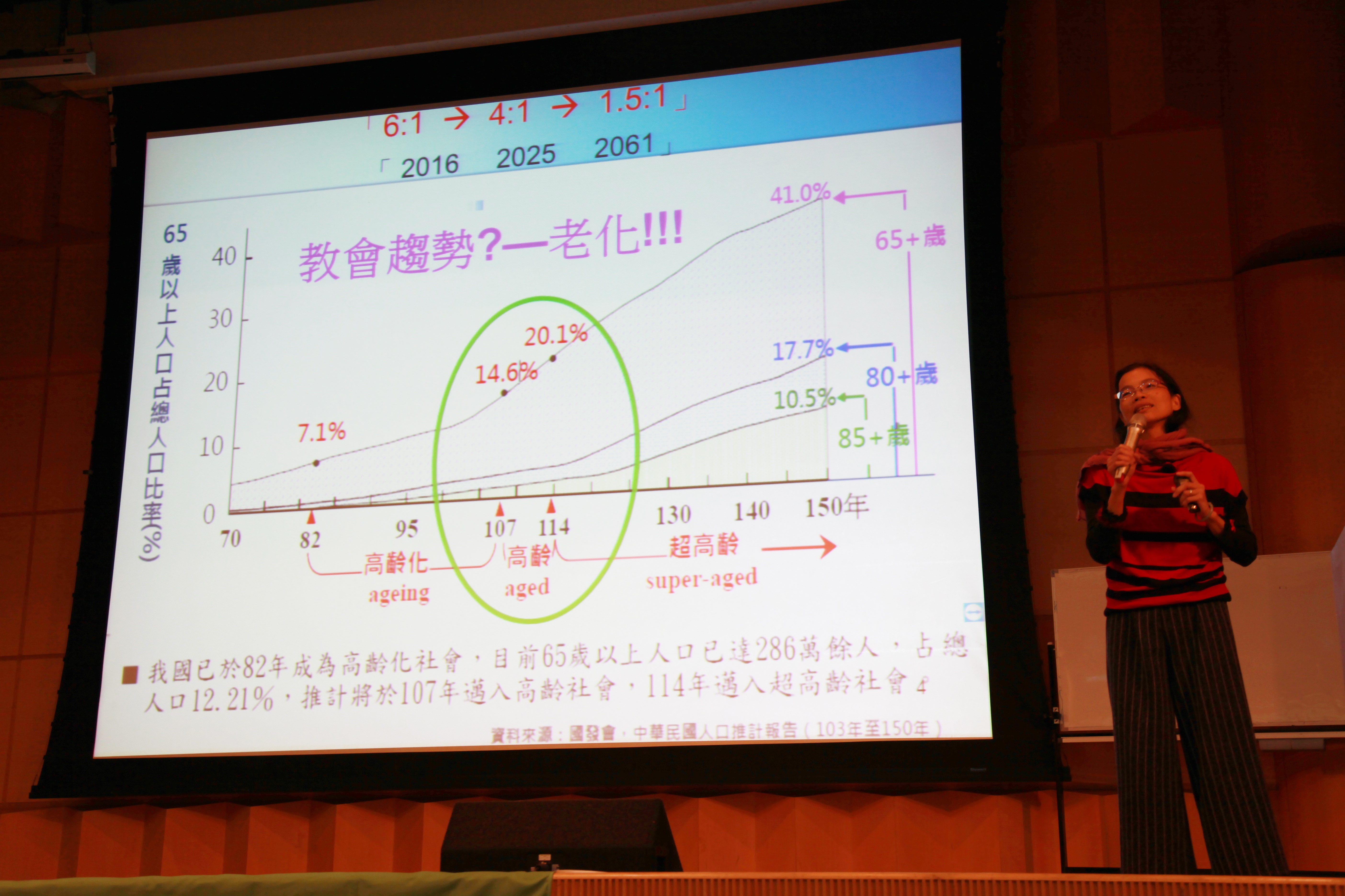 平安基金會社福辦公室主任王文秀介紹政府長照2.0政策(林佳靜攝) 平安基金會社福辦公室主任王文秀則指出,根據2014年統計,台灣人健康餘命為71歲,相對平均壽命為80歲,「老年人有8-9年必須仰賴醫療或照護才能維繫生命」。長照2.0精神強調「在地老化」及「社區整合」,讓失能長者盡可能留在自己熟悉的環境,避免不必要或過早的機構式照顧,期望讓失能長者在住家30分鐘的車程以內,就有結合醫療、照護、住宅、預防及生活支援等多元化的照顧服務。 她建議教會先從設立社區關懷據點開始,提供關懷訪視、電話問安、健康促進及餐飲服務,再逐步擴大到C點的預防與日托服務,然後連結提供複合式專業服務的B點,最後再與醫療體系的A點整合,連結成PCT的長照網絡。她建議,松年大學或松年團契只要轉型設立為據點,再連結B點,升級成為C點。她說,幾乎每個教會都已具備關懷據點的服務及功能,只是尚未向政府提出申請而已。