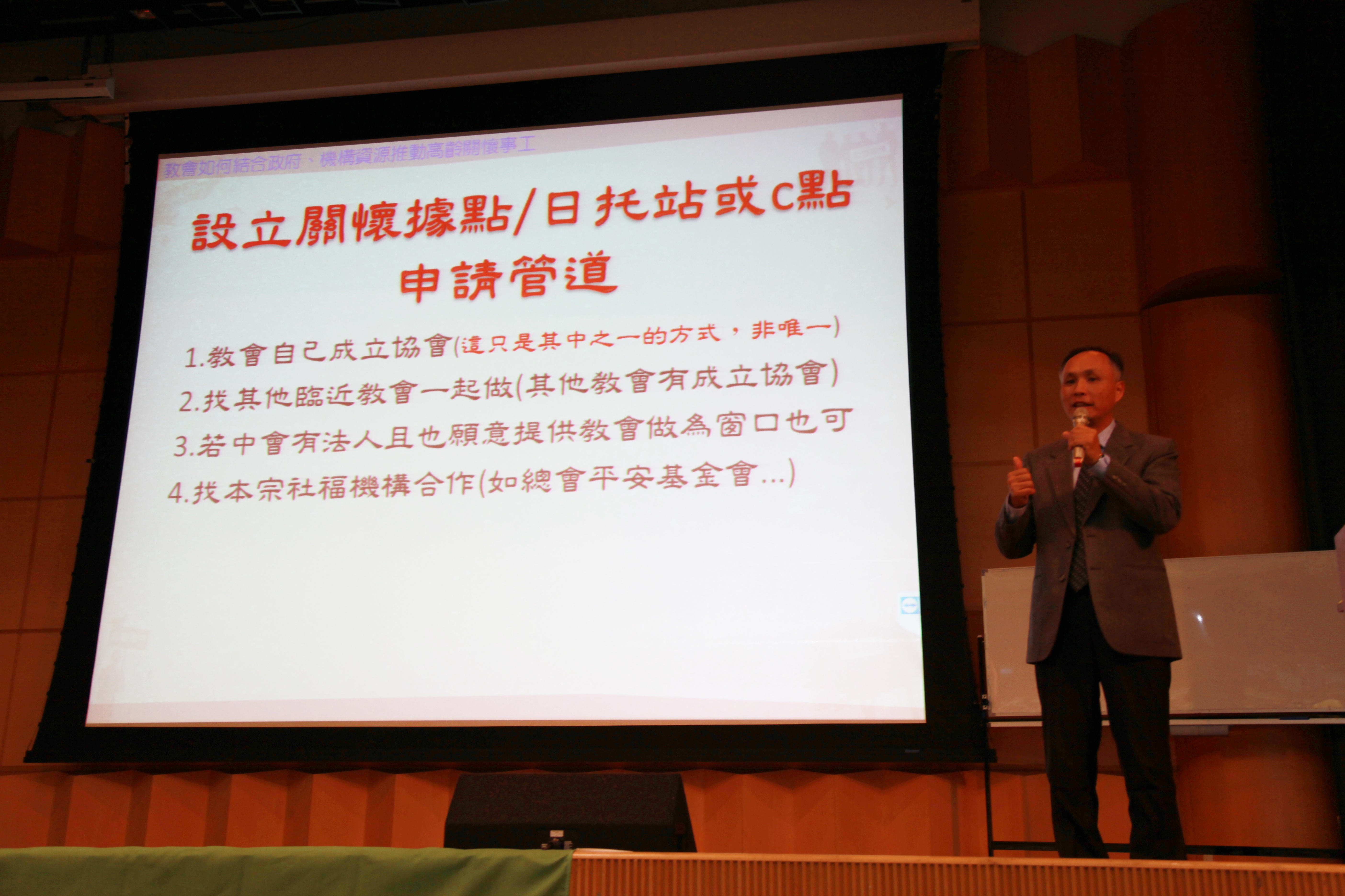 長榮大學社會力研究發展中心主任黃肇新幫助與會者腦力激盪(林佳靜攝) 下午,黃肇新老師播放由台南市政府與長榮大學輔導團隊特別聘請專業影片製作者,結合南區明興社區發展協會、安平區平安社區關懷協會、財團法人臺南市好鄰居關懷協會等三個社區照顧關懷據點協力製作的『美麗人生』紀錄片,藉由此影片回顧臺南市辦理據點歷史沿革與成果。透過影片主角的現身說法,讓與會的牧者看見教會志工投入社區關懷的許多溫馨感人的故事。接著,黃肇新老師引導大家腦力激盪,各教會松年牧長發言踴躍,包括廬山、新生、南投、鹿港、彰化、和平、虎尾、新營…等多所教會已投入或有興趣成立社區關懷據點。還在考慮的教會主要是擔心公部門核銷手續繁瑣、不知道如何成立協會、擔心經費不足、缺少交通車、教會空間小、缺乏青年志工、需要長執同意…等。 總會松年幹事陳義明牧師表示,非常感謝彰基及彰化中會大力協助場地及招待,未來會將各場次意見收集作為總會政策參考,並編製成日光關懷站範例手冊,供教會參考使用。 其他各場次時間及地點如下: 北部場:6/20(二)10:00-16:30新竹聖經學院,250人,報名截止日6/5。 南部場:7/25(二)10:00-16:30安生教會,200人,報名截止日7/10。 台東場:8/29(二)10:00-16:30台東教會,200人,報名截止日8/21。 花蓮場:11/8(三)10:00-16:30花蓮港教會,150人,報名截止日10/30。 洽詢電話:02-23625282分機256,總會松年事工委員會