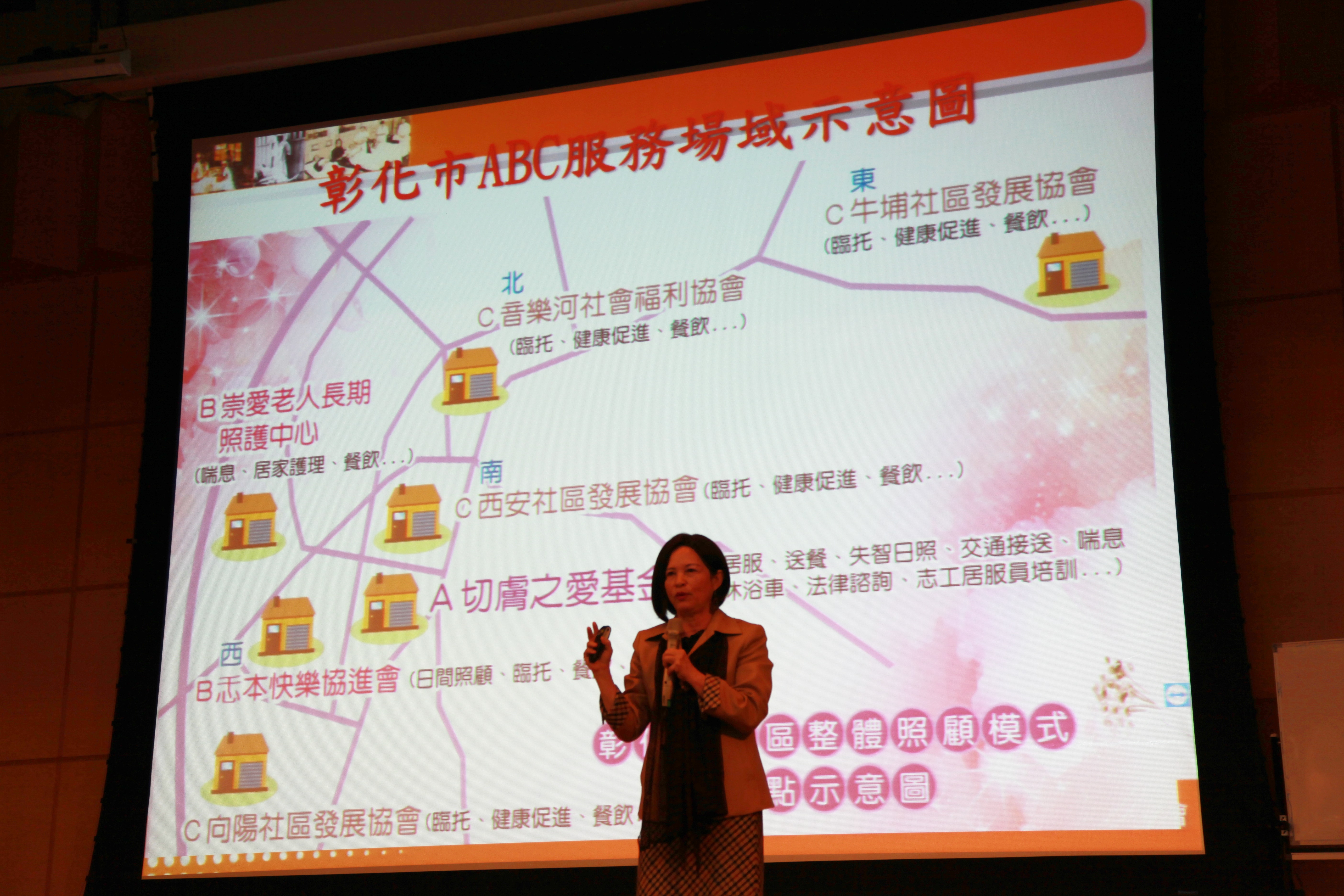 切膚之愛基金會執行長詹麗珠說明長照2.0ABC級服務模式(林佳靜攝) 民國105年彰化縣以彰化市為長照2.0試辦地點,切膚之愛基金會十多年來承接彰化縣相關長照服務,有400多名服務員,不僅照顧失智老人,還提供獨居老人送餐、沐浴車等多元服務,獲選為「長照2.0試辦服務」地點。 2016年12月16日,彰化縣長魏明谷與切膚之愛基金會董事長也是彰化基督教院長郭守仁等人,為切膚之愛基金會失智日間照顧中心—魏愛倫學苑揭牌,成為A級的長照旗鑑店,結合B級混合型日間照顧服務中心—忎本快樂協進會及崇愛老人長期照護中心、C級長照柑仔店—彰化市向陽社區發展協會、彰化市牛埔社區發展協會、社團法人彰化縣音樂河社會福利協會、彰化市西安社區發展協會等單位,為彰化市提供ABC社區整合式服務,期盼建立典範,以作為其他鄉鎮參考。 切膚之愛基金會執行長詹麗珠表示,2008年基金會即投入失智症的健康促進,2013年成立彰化縣唯一失智日間照顧中心,2017年更預計在大村鄉及埔心鄉開辦2間失智日間照顧中心。未來期望能仿效荷蘭,建置24小時失智團體家屋。她說,教會若加入ABC計畫,成為C級巷弄長照站,地方政府與A級的旗鑑店就會協助培力,包括安排活動帶領訓練、照顧服務技巧、失智者相關知能培訓等,有許多豐沛的資源。