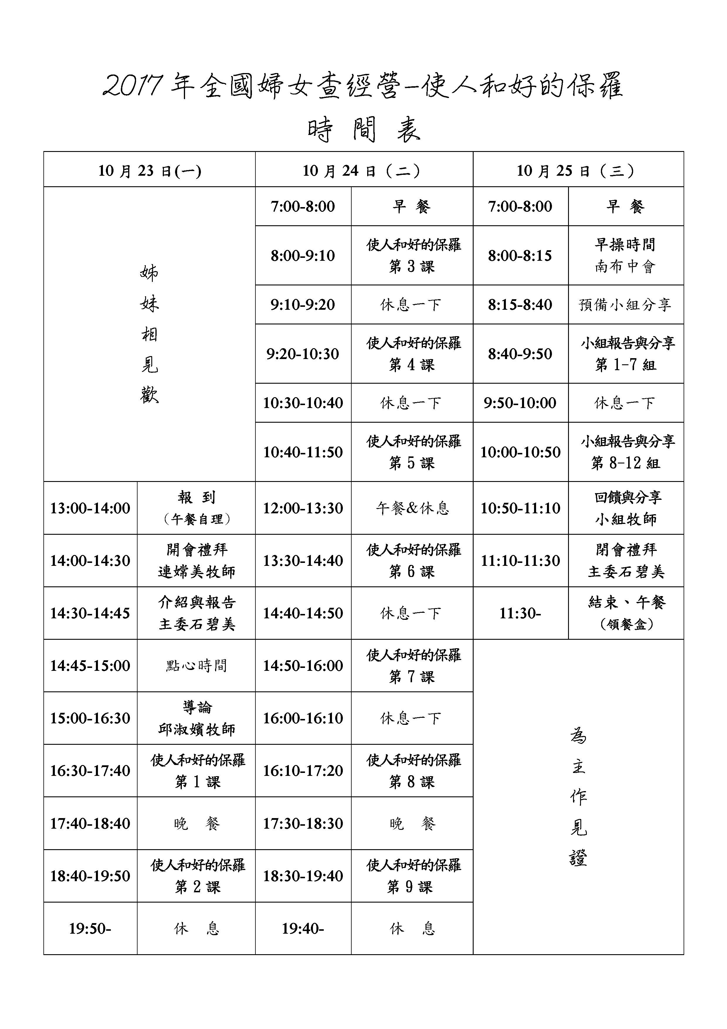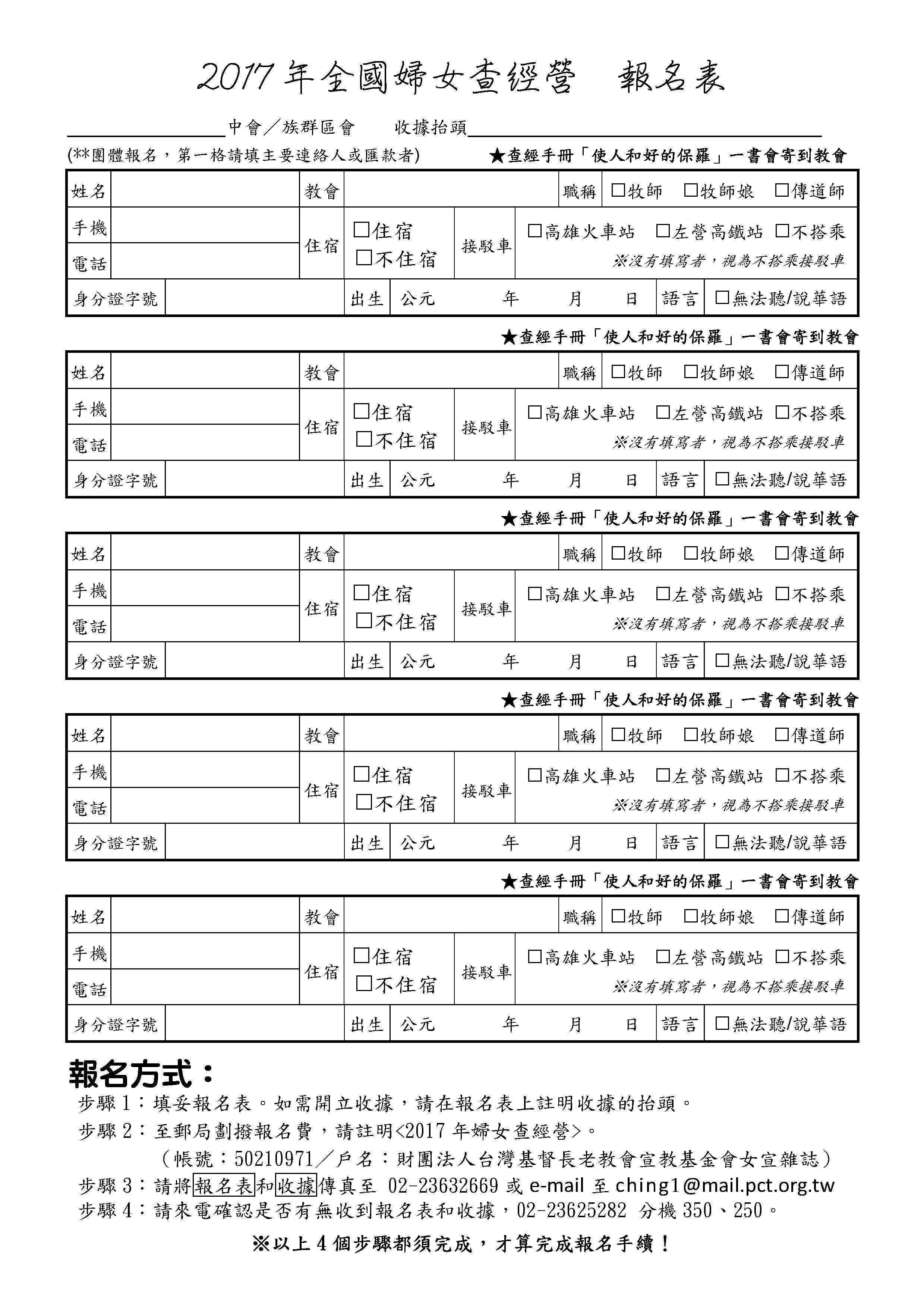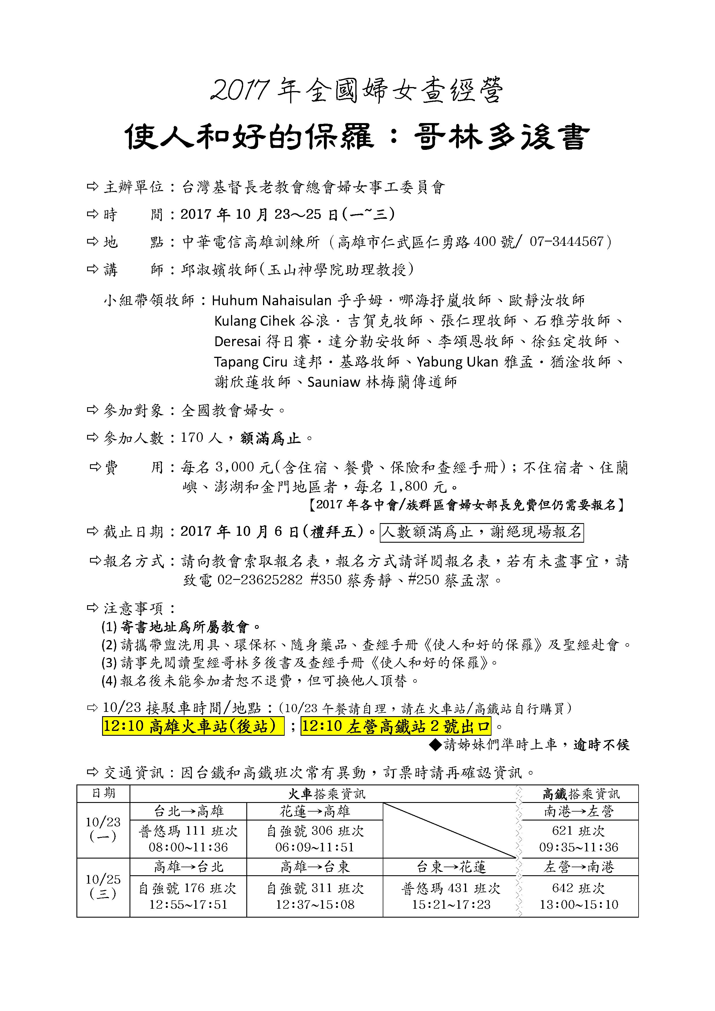使人和好的保羅 -哥林多後書的當代研究 Ø 主辦單位:台灣基督長老教會總會婦女事工委員會 Ø 時 間:2017年10月23~25日(一~三) Ø 地 點:高雄中華電信訓練中心(高雄市仁武區仁勇路400號07-3444567) Ø 講 師:邱淑嬪牧師 (玉山神學院助理教授) 小組帶領牧師: Huhum Nahaisulan乎乎姆.哪海抒嵐牧師、歐靜汝牧師 Kulang Cihek谷浪.吉賀克牧師、張仁理牧師、石雅芳牧師、 Deresai得日賽‧達分勒安牧師、李頌恩牧師、徐鈺定牧師、 Tapang Ciru達邦‧基路牧師、Yabung Ukan雅孟‧猶淦牧師、 謝欣蓮牧師、Sauniaw林梅蘭傳道師。 Ø 參加對象:全國教會婦女 Ø 參加人數:170人,額滿為止。 Ø 費 用:每名3000元;不住宿者、住蘭嶼、澎湖和金門者,每名1800元。 Ø 截止日期:2017年10月6日。人數額滿為止,謝絕現場報名 *其他報名事項和報名表,請詳見附件。