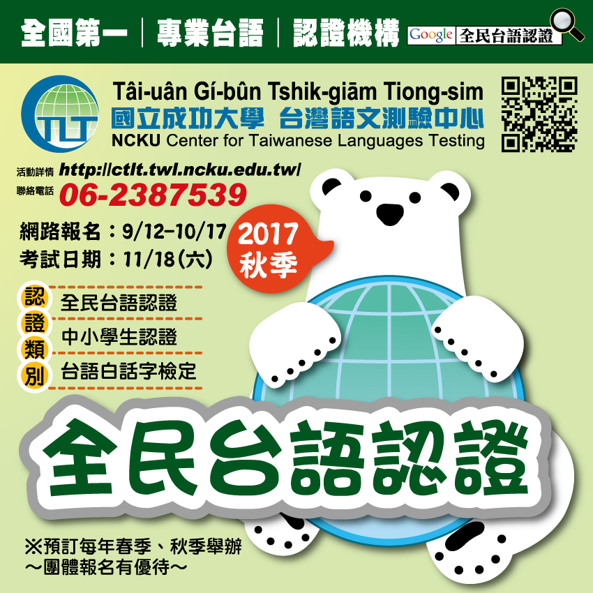 (一)為台語白話字的教育與推廣使用,鼓勵報名參加本會與成功大學台灣語文測驗中心共同舉辦之台語白話字檢定。「台語白話字檢定」是由「國立成功大學台灣語文測驗中心」與「台灣基督長老教會台灣族群母語推行委員會」共同合作研發的台語白話字(傳統教會羅馬字,也稱台灣字)能力檢定測驗系統。台語白話字檢定分為A初級、B中級及C高級三級。考生可依自己的需求選擇級別來檢定自己的台灣字能力。及格證書由本會與成功大學台灣語文測驗中心共同簽證核發。 (二)檢定日期:2017年11月18日(禮拜六) (三)網路報名:2017年9月12日10:00 〜 10月17日17:00 報名網站→http://ctlt.twl.ncku.edu.tw/poj 通訊報名:2017年10月16日 〜 10月17日(郵戳為憑) 請詳填報名表(請自行上網→http://ctlt.twl.ncku.edu.tw/poj免費下載),連同報名費劃撥憑證郵寄至:701台南市東區大學路1號修齊大樓7F台灣語文測驗中心 (四)簡章及報名事宜,請洽網址http://ctlt.twl.ncku.edu.tw/poj/index.html 試務相關事宜,請洽:06-2387539成功大學台灣語文測驗中心。
