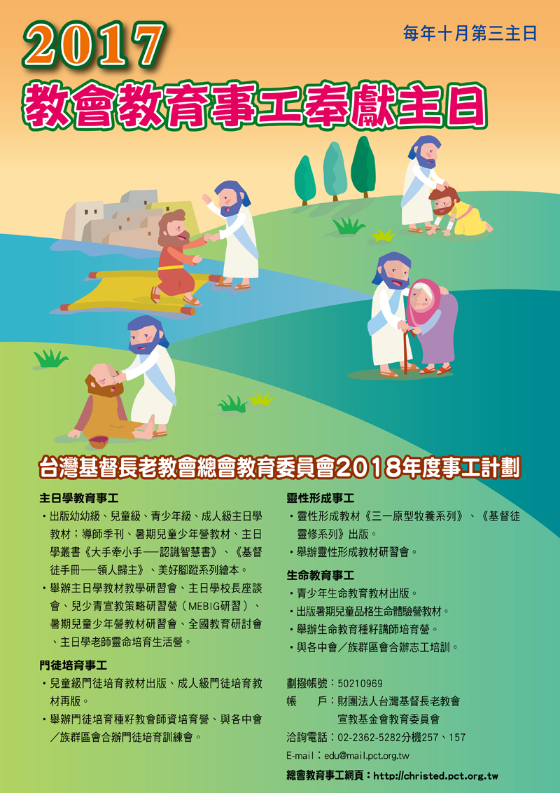 (一) 每年十月第三主日(今年是十月15日)是「教會教育事工奉獻主日」,此奉獻主日是邀請全體兄姊為長老教會的教育事工關心、代禱與奉獻。 [奉獻專戶] 劃撥帳戶:財團法人台灣基督長老教會宣教基金會教育委員會 劃撥帳號:50210969 (二) 今年適逢宗教改革500周年,總會教育委員會特邀請劉錦昌牧師撰寫《16世紀宗教改革》一書,並於今年教會教育事工奉獻主日,贈予教會一本。
