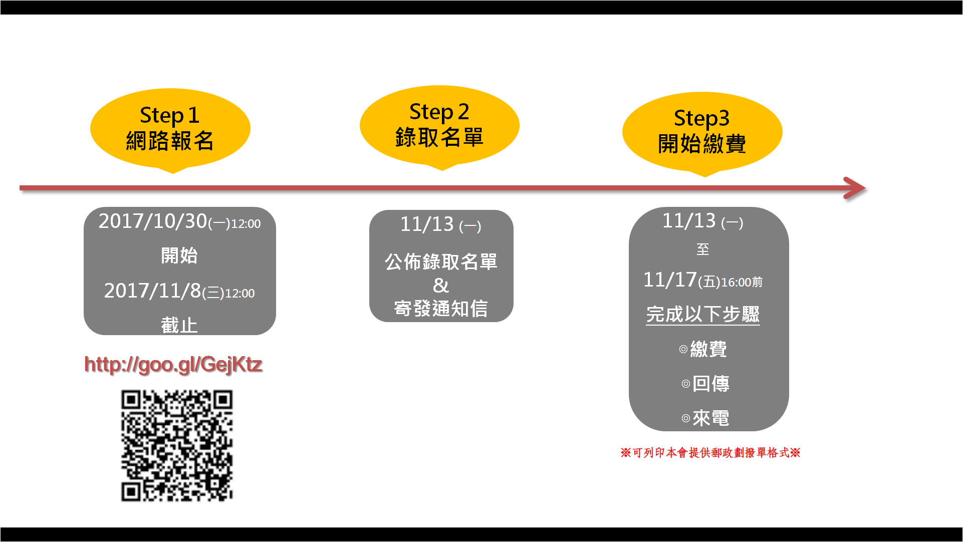 《二階報名資訊與程序》 ◎報名開始日:11月20日(一)中午12:00起 ◎報名截止日:11月27日(一)中午12:00止 - ◎公佈《二階報名》錄取者名單:2017.11.30(四) (未收到繳費通知,自行匯款者,將不予採納。) ◎二階繳費結束日:12月08日(五)16:00止