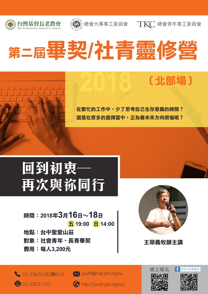 時間:2018年3月16日(禮拜五)19:00~3月18日(禮拜日)14:00地點:台中聖愛山莊(台中市太平區長龍路一段內城巷43號)講師:王榮義牧師