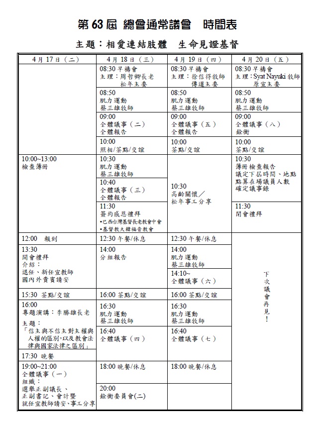 台灣基督長老教會第63屆總會通常議會4月17至20日將在台南長榮女中召開,今年的總會通常議會主題是「相愛連結肢體 生命見證基督」,將聚焦在高齡關懷與松年事工分享,已有超過600位牧長報名參加。四天三夜的會議將討論40個議案,包括收支預決算、銓衡條例的修訂、「外聘牧師、傳道師聘派條例」修正案,以及神學院和醫院等人事核定案。 第62屆總會議長陳明志牧師於3月29日召開的記者會中表示,台灣基督長老教會每年在復活節前後召開總會通常年會,今年正名為「通常議會」。他特別代表總會,感謝許多同工不論是在都市、鄉村或在深山、離島默默委身,定根在當地多年的事奉。 今年的執行幹事林偉聯牧師則說明第63屆總會通常議會的重點項目。開會禮拜後的專題演講,將邀請有人權律師美譽的李勝雄長老分享,題目是「信主與不信主對主權與人權的區別,以及教會法律與國家法律之區別」。 18日上午,將舉行簽約感恩禮拜,分別與巴西台灣基督長老教會中會(Igreja Presbiteriana de Formosa do Brasil (Presbitério))和基督教大韓福音教會(Korean Evangelical Church, KEC)締結為夥伴教會,以合作推動宣教事工。陳明志牧師表示,這次與巴西簽約的教會,是台灣人的教會,他曾出訪巴西,看見早期台灣人移民到巴西、認同當地,他們長期關懷弱勢家庭,服務人次有2、3千人,讓他很感動。這次簽訂合作協議,主要是因為第一代移民對台灣仍有感情,可以長期合作,彼此分享;若沒把握機會,將來第二、三代起來,要談合作就更困難了。 19日上午,安排「高齡關懷/松年事工分享」,以「上帝的家—高齡友善教會」為題,邀請松年事工主委周哲卿長老分享松年事工的大事記,泰雅爾中會總幹事Yabu Eyo牧師分享中會協助地方教會推展高齡事工的角色、做法和功能,以及透過影片及戲劇呈現高齡關懷事工需求、現況事工及未來發展,期望建立高齡友善教會使教會成為社區的盼望與祝福。 林偉聯牧師表示,為因應台灣邁入高齡化社會,政府於2016年七月起試辦「長照10年計畫2.0」(長照2.0),強調「社區整合」與「在地老化」。而長老教會擁有學校、醫院和社福機構,以及總會、中會及地方教會的組織網絡,是最適合承接「社區整合」與「在地老化」的角色與使命。他說,總會松年事工委員會與平安基金會,除了介紹政府長照資源外,也邀請已開辦社區高齡關懷事工的教會經驗分享。2017年新倍加年度宣教會議中,總會以「活力松年一領一」為題,討論各中會、區會如何整合松年事工、「一領一」傳福音,也協助地方教會成為高齡關懷的據點。 他舉例,平安基金會十年前與澎湖縣政府合作,協助照顧澎湖失智失能老人等族群,2014年5月23日啟用台灣基督長老教會澎湖宣教中心暨澎湖縣平安馬公日間照顧中心;在北部還有社會相當肯定的雙連安養中心,可以看到不論總會或地方教會,都對高齡關懷和松年事工相當投入。