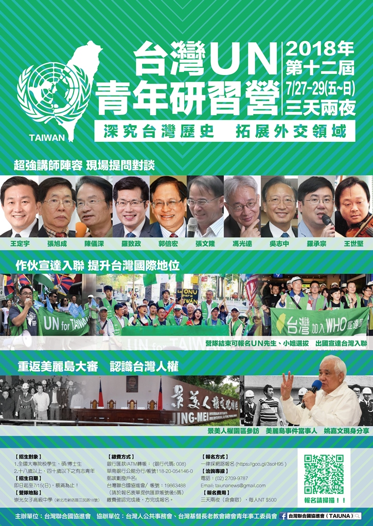 台灣聯合國協進會(TAIUNA)主辦、本會合辦第12屆「2018台灣UN青年研習營」探究台灣歷史 拓展外交領域超強講師陣容 現場提問對談、作伙宣達入聯 提升台灣國際地位、重返美麗島大審 認識台灣人權