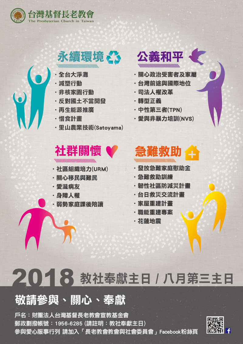 敬請各教會牧長、信徒關心8月19日(8月第三主日)今年度「教社奉獻主日」並為我教會教社事工代禱及奉獻由。 說 明: 一、敬請各教會接受中會/族群區會安排交換講台或自行報告教社事工,並鼓勵信徒為事工經費關心奉獻。 二、本會受全體教會之託,致力於下列主要事工及計畫(從2017年8月起至2018年7月止): (一).公義和平: 1. 以正名、制憲、入聯路線,推動台灣成為新而獨立的國家,與民間社團共同發起「東京奧運正名公投連署」。 2. 關心政治受害者及家屬,辦理相關追思紀念會及聲援行動。 3. 強化居住正義與就業安全,關心國人基本人權中生存權及就業權問題。 4. 推動世界人權日、人權事工(含司法改革)。 5. 推動轉型正義。 6. 持續鼓勵各中會/族群區會設立公義行動教會。 7. 辦理及推廣社會行動培訓事工如:中性第三者(TPN)、愛與非暴力(NSV)。 (二)永續環境: 1. 推動非核家園,重申反核宣言,與反核團體合作辦理「2018廢核遊行」。 2. 推動「2018環保行動」、「惜食計畫」,邀請全台教會、機構共同參與實踐垃圾減量減塑、珍惜食物。 3. 鼓勵各中會/族群區會分區辦理「全台大淨灘/川/溪/山」活動。 4. 推廣再生能源,加入「台灣再生能源推動聯盟」。 5. 反對國土不當開發,參與「礦業改革 撤銷亞泥」行動。 6. 倡議里山農業技術(Satoyama),還給土地一個和諧共融的新境界。 (三)急難救助: 1. 受理各中會/族群區會教社部及普世教會轉介急難救助個案申請。 2. 辦理跨機構急難救助合作事工,強化地區資訊交流與合作。 3. 不定期舉辦急難救助訓練及防災、減災訓練,建立韌性部落/社區。 4. 鼓勵所屬醫院推動偏遠醫療及跨國義診。 5. 辦理家屋重建方案。 6. 辦理台日救災交流計畫 7. 關心國內「花蓮地震」受災狀況,提供關懷陪伴、職能重建關懷方案等。 (三)社群宣教: 1. 於12月舉辦關懷愛滋主日,身心障礙者關懷日、關心移民與難民。 2. 舉辦組織領導訓練課程(URM),強化社區組織人才培訓。 3. 關心移民與難民。 4. 爭取公、私部門資源來協助地方教會進行弱勢家庭課後陪讀。 四、邀請大家參與教社事工,關心、奉獻!願上帝祝福我們所做的事工! 五、參與改造社會、愛心服事、關懷受造界行列,請成為長老教會教會與社會委員會Facebook專頁粉絲,按讚追蹤最新事工消息。網址:https://www.facebook.com/pctsociety或掃描QRcode。 六、交換講台事宜請聯繫各中會/族群區會教社部長。其他問題,請聯絡: 總會教社委員會,02-2362-5282;幹事林偉聯牧師,分機155;助理劉嘉芬姐妹,分機255。教社電子信箱:society@mail.pct.org.tw | 奉獻款請寄郵政劃撥:1956-6285 《通訊欄備註:教社主日》 戶名: 財團法人台灣基督長老教會宣教基金會 | 敬頌 主恩永相隨 主 委 林世杰