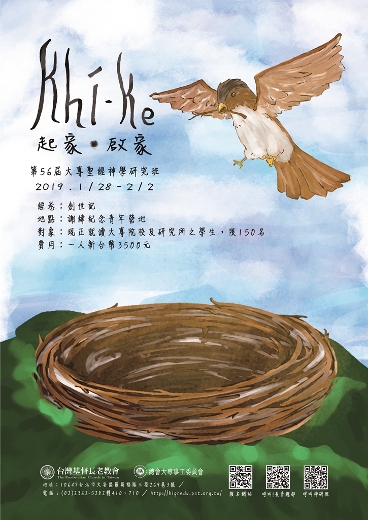 2019年第56屆大專聖經神學研究班《創世記》「 起家 ․ 啟家Khí-ke」食雞,會起家;食鰇魚,生囡仔好育飼。「khí-ke」是台灣人勾勒出一個家的樣貌之始。然而人們總是期盼著安家立業,卻又嚮往著行旅於外面的世界。 起家,建立起一個家的輪廓;啟家,則開啟這趟未知的信心之旅。在起家與啟家的旅程中,上主與人們同在、同行。