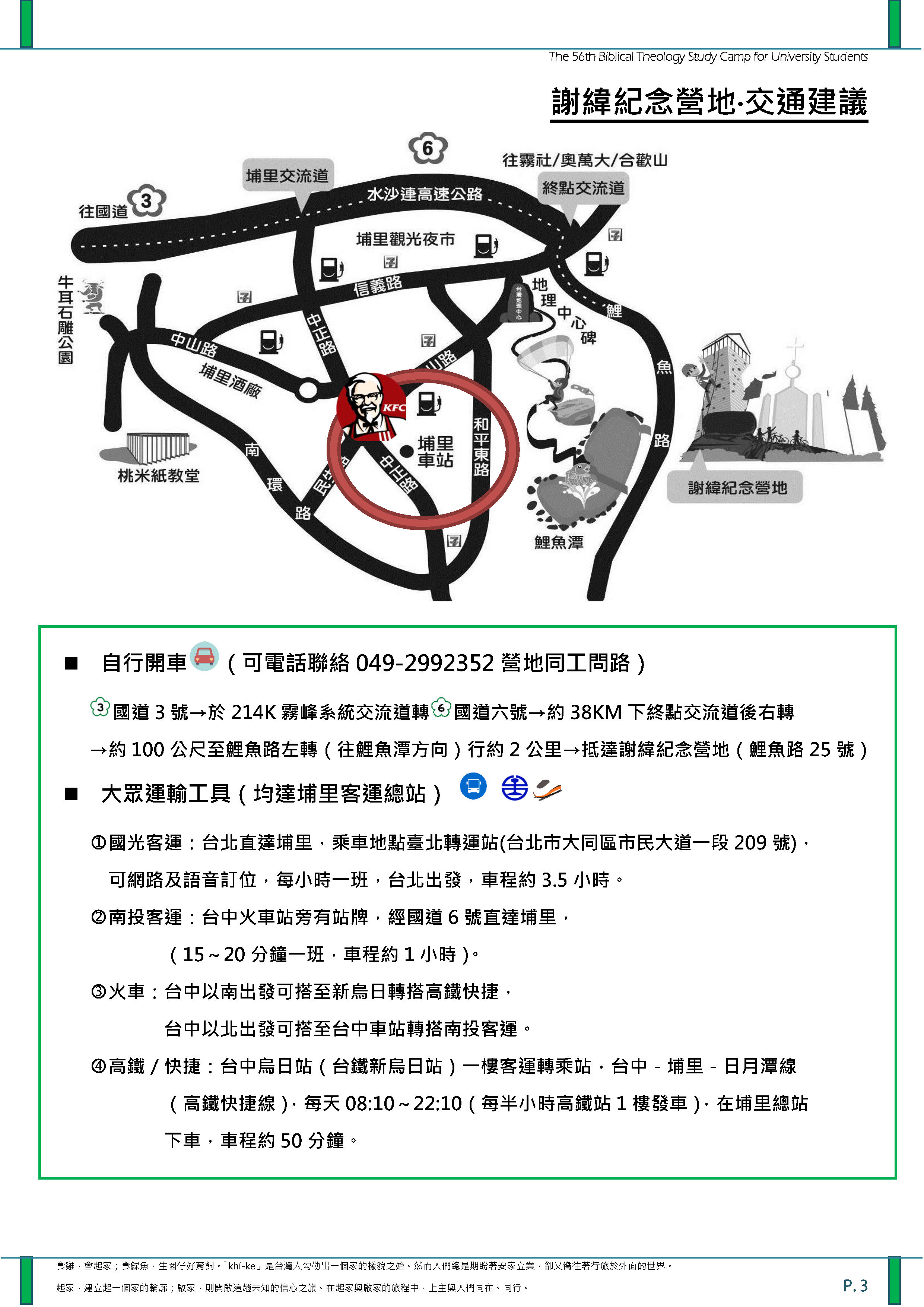 聯絡資訊 台灣基督長老教會總會大專事工委員會 大專幹事:李信仁牧師 總 召 林琬婷牧師 0912-270-548 副 召 吳明漢牧師 0912-149-912 副 召 蔡恆偉傳道師 0920-631-124 同 工吳雨樺小姐 0936-858-465 電子郵件:highedu@mail.pct.org.tw 第56屆大專聖經神學研究班籌備團隊 謹上 營會流程 | 日期 時間 | 1月28日 (禮拜一) | 1月29日 (禮拜二) | 1月30日 (禮拜三) | 1月31日 (禮拜四) | 2月1日 (禮拜五) | 2月2日 (禮拜六) | | 08:00-08:30 | | 早 禱 | | 08:30-09:10 | 活力早餐 | | 09:10-10:00 | 小組研讀 (1-6章) | 小組研讀 (13-18章) | 小組研讀 (26-31章) | 小組研讀 (39-44章) | 整理各組場地 | | 10:00-10:10 | 閉會禮拜 | | 10:20-11:30 | 小組討論 | | 11:30-11:50 | 整理大會場 | | 12:00-12:30 | 午餐和休息 (13:30-14:00歌詠練習) | | 12:30-13:30 | 報到 | 午餐 | | 13:30-14:00 | | 14:00-15:00 | 開會禮拜 | 小組研讀 (7-12章) | 小組研讀 (19-25章) | 小組研讀 (32-38章) | 小組研讀 (45-50章) | | | 15:00-16:30 | 專講一 如何讀聖經 長青人讀經x 長青人信仰 吳祈得傳道師 | 小組討論 | | 16:40-17:50 | 小組時間 | Workshop工作坊 | | 18:00-19:00 | 滋養晚餐 | 大專晚餐 | | 19:00-19:30 | 書籍介紹 | 籌委選舉 | | 19:30-19:50 | 敬 拜 | | 19:50-20:00 | 專講二 《創世記》 導論 羅光喜牧師 | 專講三 《創世記》 1章~12章 大地/土地 曾宗盛牧師 | 專講四 《創世記》 13章~25章 亞伯拉罕之約 胡維華牧師 | 專講五 《創世記》 26章~38章 從以撒看原生 家庭的影響 胡瑞芝老師 | | 20:00-21:00 | 獻心會 | | 21:00-21:30 | Q & A | | 21:30-22:00 | 小組晚禱 | | 22:00-22:30 | 晚 安 | 小組晚禱 | 交通建議 _頁面_3.jpg)