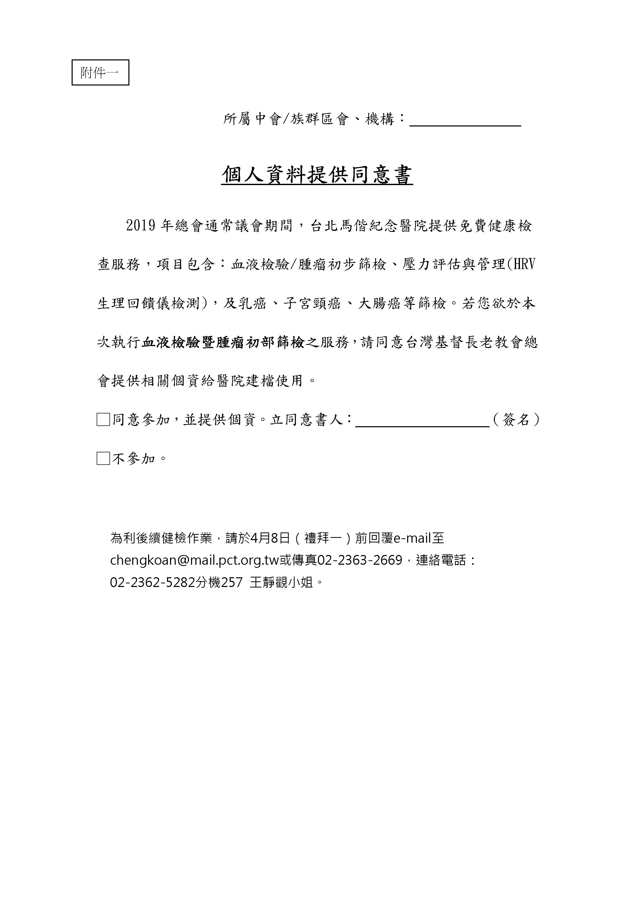平安!! 第64屆總會通常議會期間,台北馬偕紀念醫院提供參加第64屆總會通常議會所有單位的正議員、參議員、觀察員免費健康檢查服務,項目包含:血液檢驗/腫瘤初步篩檢、壓力評估與管理(HRV生理回饋儀檢測),及乳癌、子宮頸癌、大腸癌等篩檢。 為配合台北馬偕紀念醫院於2019年4月24日(三)早上7:30~9:00進行血液檢驗/腫瘤初步篩檢前置作業,需於檢查前二個禮拜進行個人資料建檔,若參加會議者欲於本次執行血液檢驗暨腫瘤初部篩檢之服務,請於4月8日(禮拜一)前回覆個人資料提供同意書(如附件) e-mail至chengkoan@mail.pct.org.tw或傳真02-2363-2669。隨函附上公文和個人資料提供同意書,連絡電話:02-2362-5282分機257 王靜觀小姐, 提醒您!! 逾期回覆則此次無法執行血液檢驗暨腫瘤初部篩檢之服務。 64屆總會通常議會 執行幹事 連嫦美牧師 |