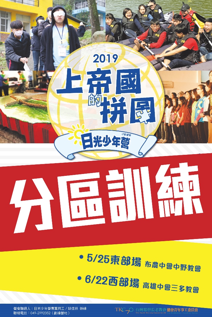 「2019年中會、族群區會與教會夏令營同工訓練會」主要是為了協助並推廣各中會、族群區會及教會辦理青少年營會。訓練會中將分享日光少年營的生命教育早晚禱教案、營會活動教案設計與體驗教育課程,協助訓練夏令營會籌備同工 。 【參加對象】 國中以上,中會/族群區會、教會現任幹部或契友,對營會服事有熱誠之青年。 【場次資訊】 5/25 東部場:布農中會中野教會,敬邀東部地區各中會/族群區會派員參加。6/22 西部場:高雄中會三多教會,敬邀西部地區各中會/族群區會派員參加。【報名截止】各區訓練日期前一週之禮拜日。請填寫報名表,E-mail或傳真回覆。 ◎該區課程報名低於20人不開課。 ◎報名費用每人300元 (含課程、講師、餐點、教材、保險),現場繳交即可 。