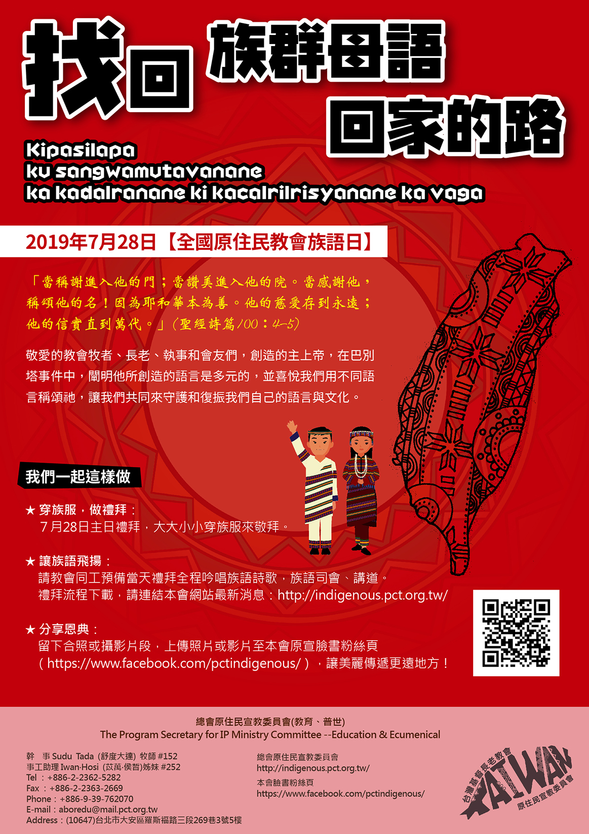 圖/年度 布農中會花布教會/2018族語日 提供 總會原住民宣教委員會(教育、普世) The Program Secretary for IP Ministry Committee --Education & Ecumenical 幹事 Sudu Tada (舒度大達) 牧師 #152 事工助理 Iwan Hosi (苡萬‧侯皙)姊妹 #252 Tel : 886-2-2362-5282 Fax : 886-2-2363-2669 E-mail:aboredu@mail.pct.org.tw Address:(10647)台北市大安區羅斯福路三段269巷3號 總會原住民宣教委員會 http://indigenous.pct.org.tw/ 本會臉書粉絲頁https://www.facebook.com/pctindigenous/ |