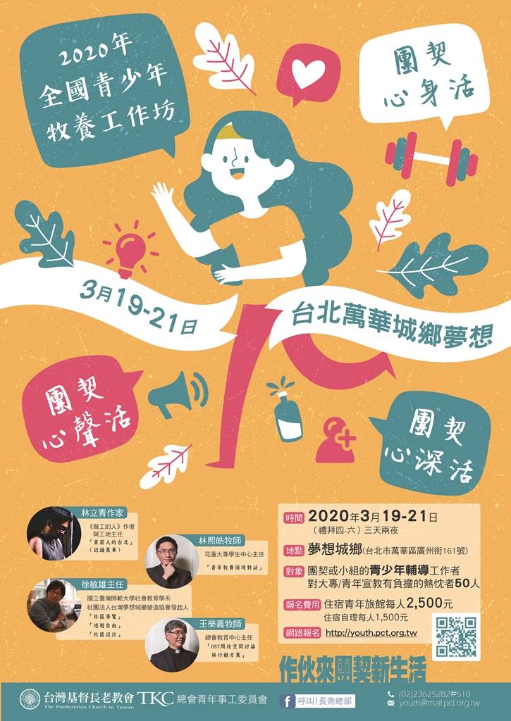 專案窗口 台灣基督長老教會總會青年事工委員會 大專/青年幹事:李信仁牧師 事工組長:王永宏先生 電話:02-23625282轉510 傳真:02-23631722 電子郵件:youth@mail.pct.org.tw