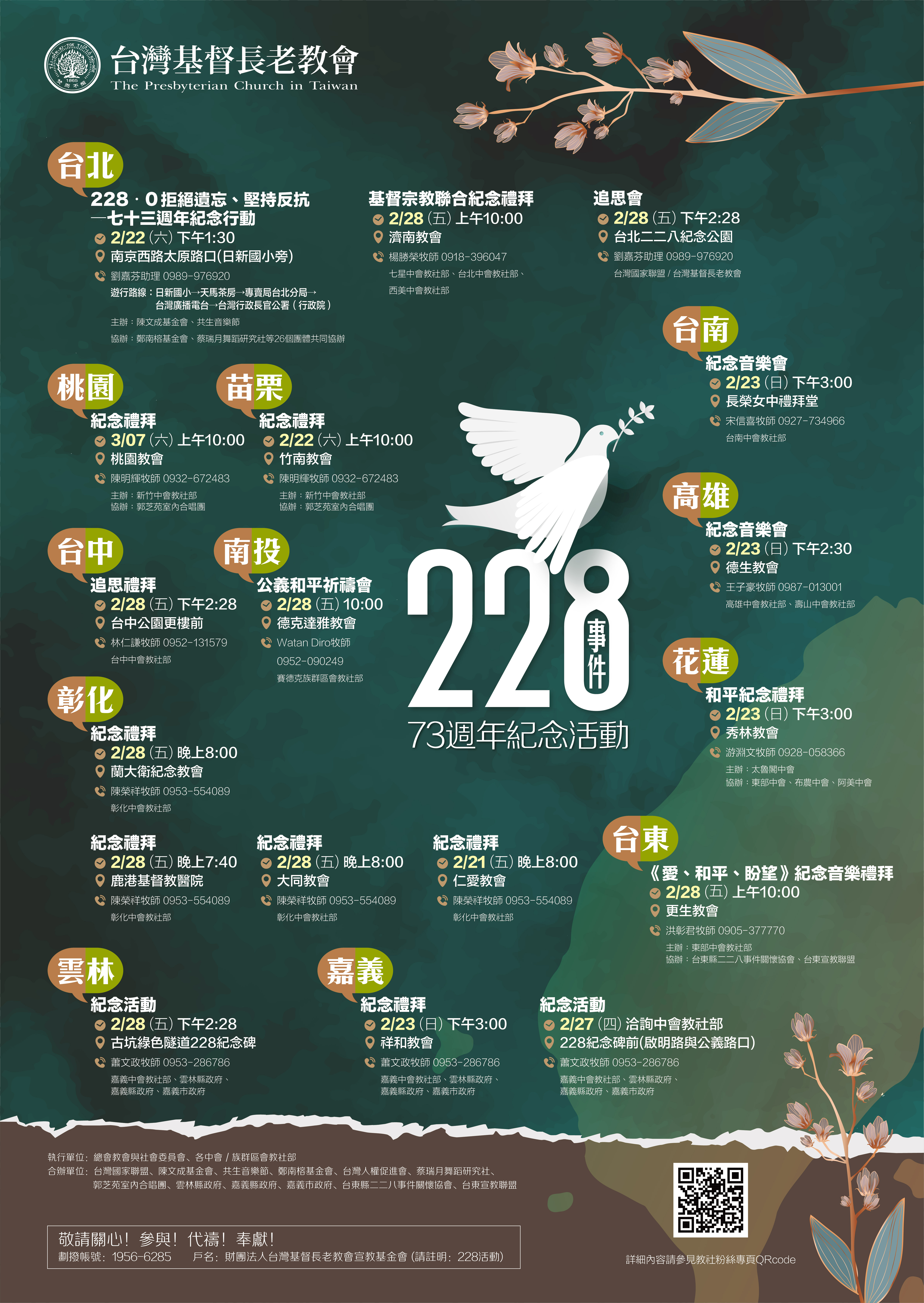 由於中央疫情防疫指揮中心一級開設。今年度二二八事件73週年追思活動除已辦理完畢的活動,其餘本會主辦的皆暫停。(但是若有與公部門合辦者,請活動主辦者自行斟酌)。 總會教社主委:林仁謙牧師 更新時間:2020.02.27 | 區域 | 日期 | 時間 | 地點 | 主題/內容 | 主辦/協辦單位 | 活動地址 | | 台北 | 02/22(六) | 下午1:30 | 南京西路太原路口(日新國小旁) | 228‧0拒絕遺忘、堅持反抗 七十三週年紀念行動 | 主辦單位:陳文成基金會、共生音樂節 協辦單位:鄭南榕基金會、蔡瑞月舞蹈研究社等26個團體共同協辦 | 遊行路線:日新國小→天馬茶房→專賣局台北分局→台灣廣播電台→台灣行政長官公署(行政院) | | 02/28(五) | 上午10:00 | 濟南教會 | 基督宗教聯合紀念禮拜 | 七星中會教社部、台北中會教社部、西美中會教社部 | 暫停辦理 | | 02/28(五) | 下午 2:28 | 台北二二八紀念公園 | 追思會 | 台灣國家聯盟/台灣基督長老教會 | 暫停辦理 | | 桃園 | 03/07(六) | 上午10:00 | 桃園教會 | 紀念禮拜 | 主辦:新竹中會教社部 協辦:郭芝苑室內合唱團 | 暫停辦理 | | 苗栗 | 02/22 (六) | 上午10:00 | 竹南教會 | 苗栗縣竹南鎮民族街11號 | | 台中 | 02/28(五) | 下午 2:28 | 台中公園更樓前 | 追思禮拜 | 台中中會教社部 | 暫停辦理 | | 南投 | 02/28(五) | 上午10:00 | 德克達雅教會 | 公義和平祈禱會 | 賽德克族群區會教社部 | 暫停辦理 | | 彰化 | 02/28(五) | 晚上8:00 | 蘭大衛紀念教會 | 紀念禮拜 | 彰化中會教社部 | 暫停辦理 | | 02/28(五) | 晚上7:40 | 鹿港基督教醫院 | 紀念禮拜 | 暫停辦理 | | 02/28(五 | 晚上8:00 | 大同教會 | 暫停辦理 | | 02/21(五) | 晚上8:00 | 仁愛教會 | 彰化縣芳苑鄉新寶村中正路995號 | | 雲林 | 02/28(五) | 上午10:00 | 古坑綠色隧道228紀念碑 | 2020讓愛滿盈紀念活動 | 嘉義中會教社部、雲林縣政府、嘉義縣政府、嘉義市政府 | 雲林縣古坑鄉湳仔村台三線旁 | | 嘉義 | 02/23(日) | 下午3:00 | 祥和教會 | 紀念禮拜 | 嘉義縣太保市博學路257號 | | 02/27(四) | 上午9:30 | 228紀念碑前(啟明路與公義路口) | 愛、公義、和平 紀念禮拜 | 嘉義市大雅路與啟明路交叉路口 | | 02/28(五) | 上午10:00 | 嘉義縣政府廣場 | 可以原諒,不可忘記。 | 暫停辦理 | | 台南 | 02/23(日) | 下午3:00 | 長榮女中禮拜堂 | 紀念音樂會 | 台南中會教社部 | 暫停辦理 | | 高雄 | 02/23(日) | 下午2:30 | 德生教會 | 紀念音樂會 | 高雄中會教社部、 壽山中會教社部 | 暫停辦理 | | 花蓮 | 02/23(日) | 下午3:00 | 秀林教會 | 和平紀念禮拜 | 主辦:太魯閣中會 協辦:東部中會、布農中會、阿美中會 | 暫停辦理 | | 台東 | 02/28(五) | 上午10:00 | 更生教會 | 《愛、和平、盼望》紀念音樂禮拜 | 主辦:東部中會教社部 協辦:台東縣二二八事件關懷協會、台東宣教聯盟 | 暫停辦理 | 執行單位:台灣基督長老教會總會教會與社會委員會、各中會/族群區會教社部 |
