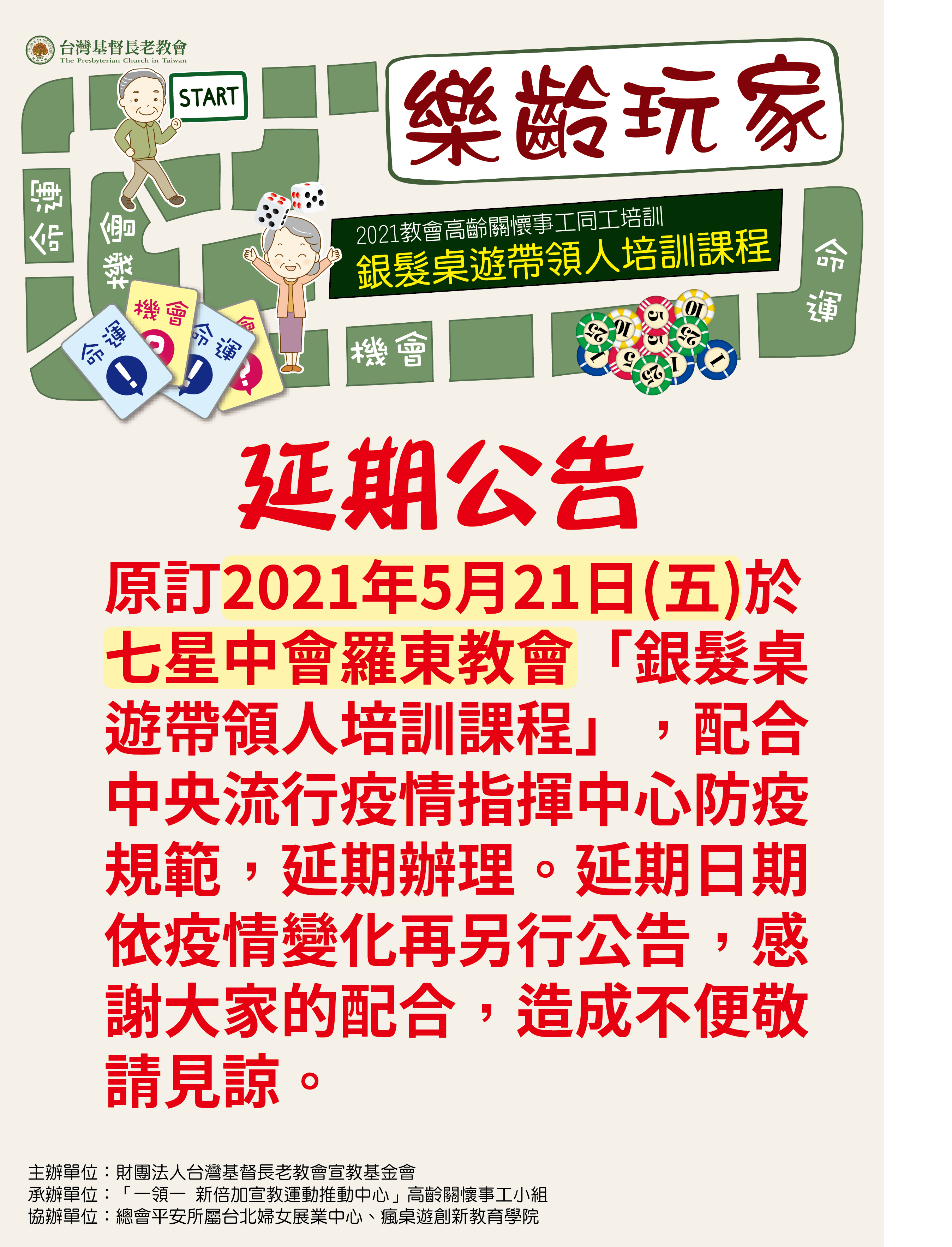 ◆高齡關懷事工小組:5月29日(六)於澎湖馬公朝陽活動中心舉辦「桌遊帶領人培訓課程」,延期舉行。