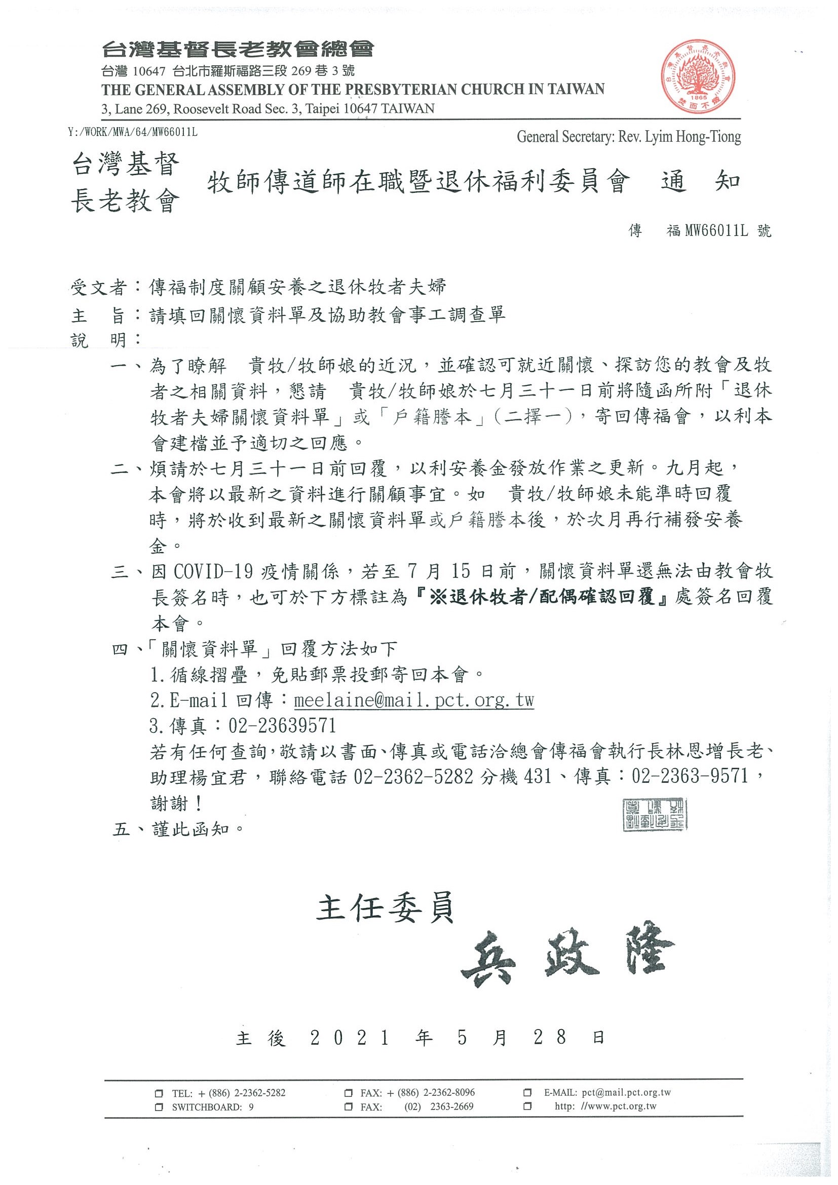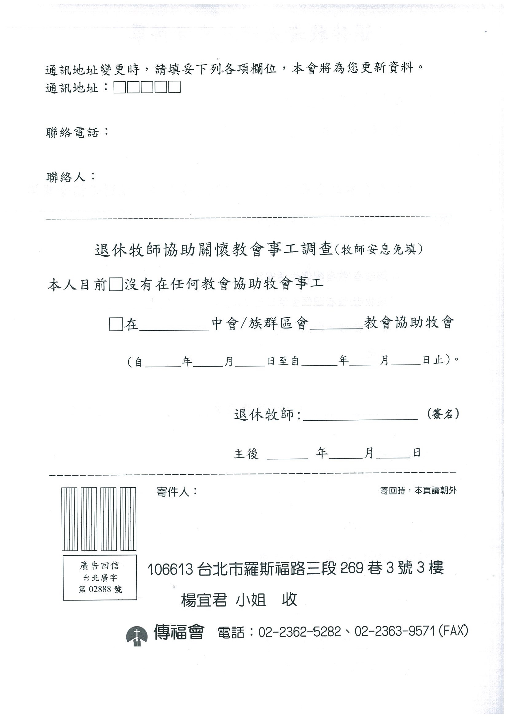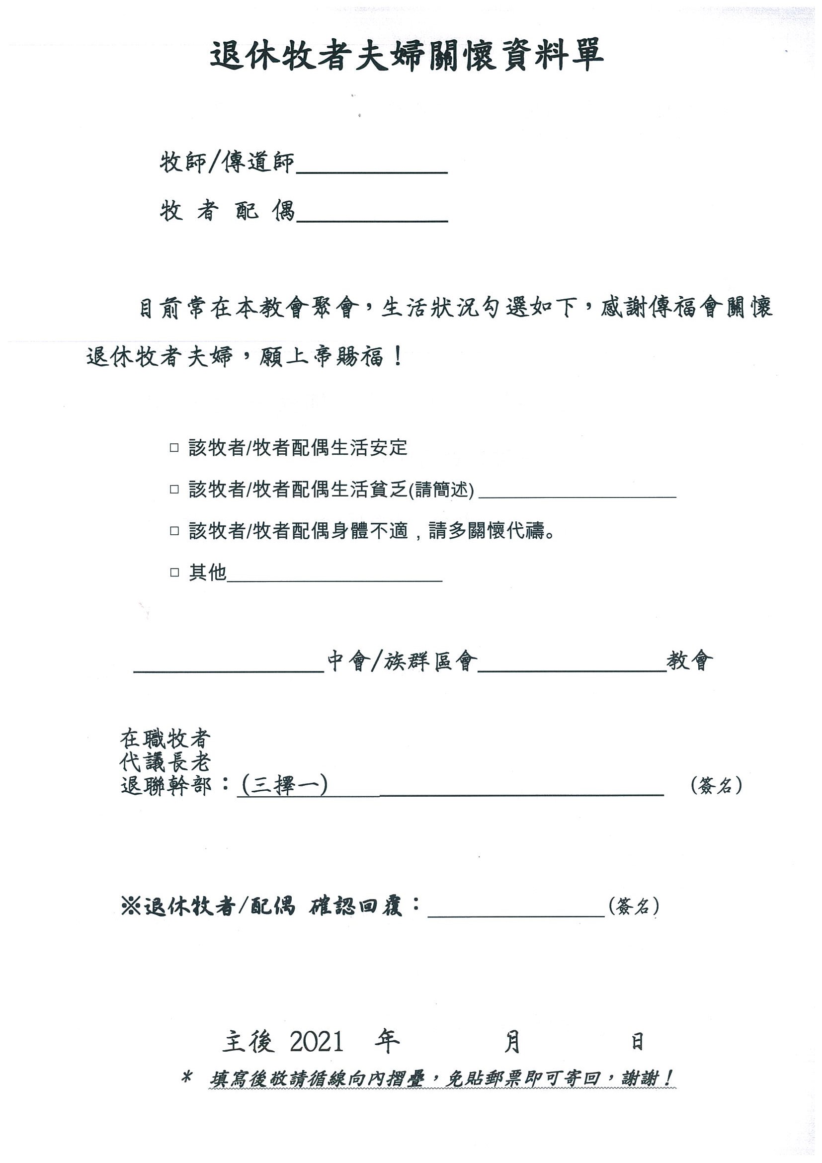 為了瞭解退休牧者夫婦的近況,並確認可就近關懷、探訪的教會及牧者之相關資料,懇請退休牧師/牧師娘於7月31日前將『退休牧者夫婦關懷資料單』或『戶籍謄本』(二擇一),寄回傳福會,以利本會建檔並予適切之回應。 請於7月31日前回覆,以利安養金發放作業之更新。9月起,本會將以最新之資料進行關顧事宜。如 未能準時回覆時,將於收到最新之關懷資料單或戶籍謄本後,次月再行補發安養金 因COVID-19疫情關係,若至7月15日前,關懷資料單還無法由教會牧長簽名時,也可於下方標註為『※退休牧者/配偶確認回覆』處簽名回覆本會。 『關懷資料單』回覆方法如下: 1.循線摺疊,免貼郵票投郵寄回本會 2.E-mail回傳:meelaine@mail.pct.org.tw 3.傳真:02-23639571 |