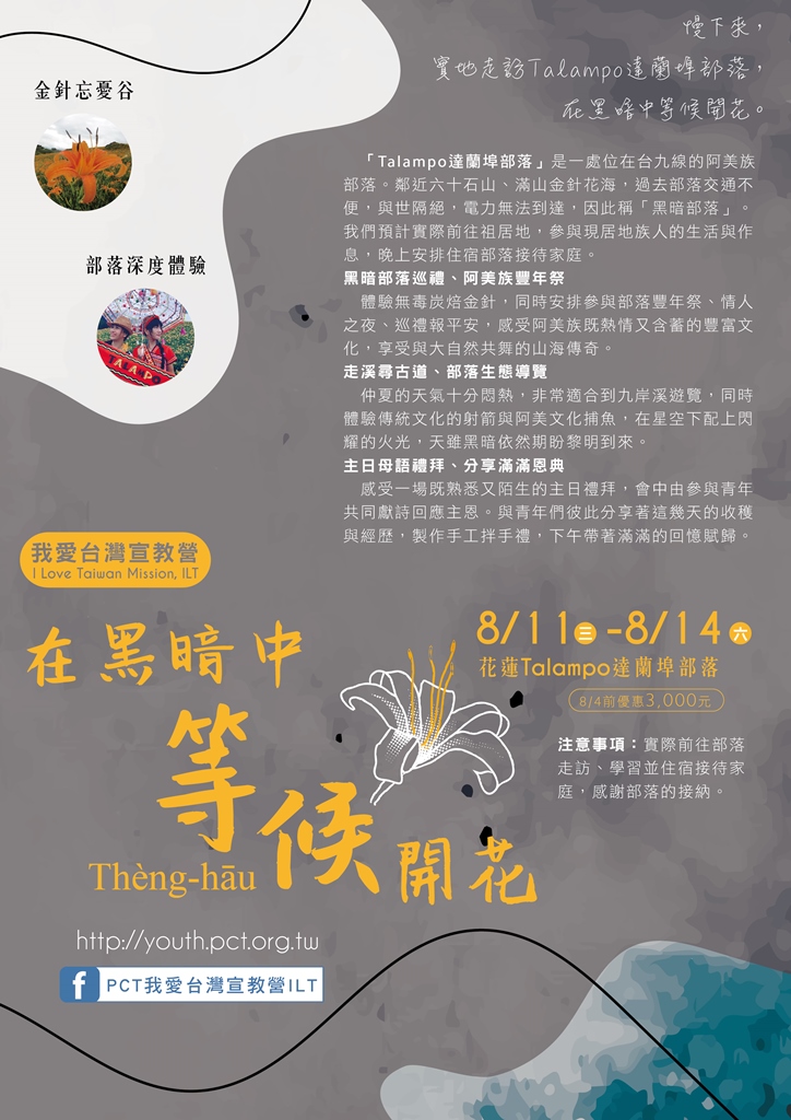 「Talampo達蘭埠部落」是一處位在台九線的阿美族部落。鄰近六十石山、滿山金針花海,過去部落交通不便,與世隔絕,電力無法到達,因此稱「黑暗部落」。我們預計實際前往祖居地,參與現居地族人的生活與作息,晚上安排住宿部落接待家庭。