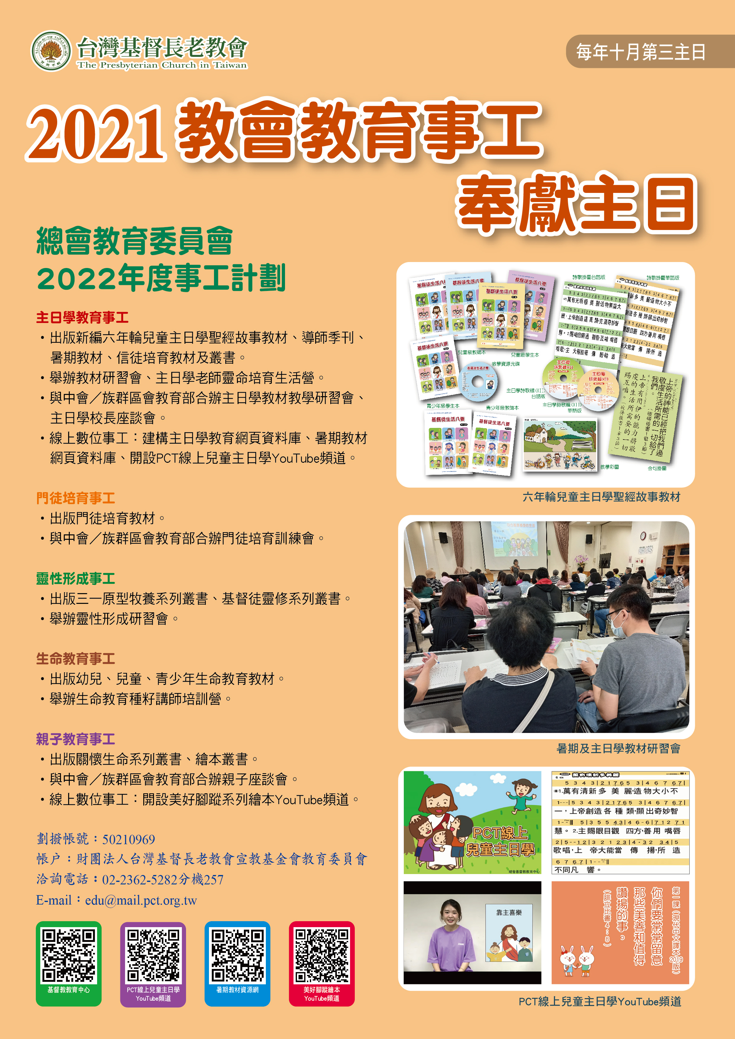 每年十月第三主日(2021年是10月17日)是總會所訂「教會教育事工奉獻主日」。感謝上帝的恩典,眷顧保守我教會教育事工。總會教育委員會於未來年度事工計畫中,將持續推動主日學教育事工、門徒培育事工、靈性形成事工、生命教育事工與親子教育事工。敬請各位牧長藉著「教會教育事工奉獻主日」在各中會/族群區會內交換講台,並於禮拜中向各教會兄姐請安與報告。
