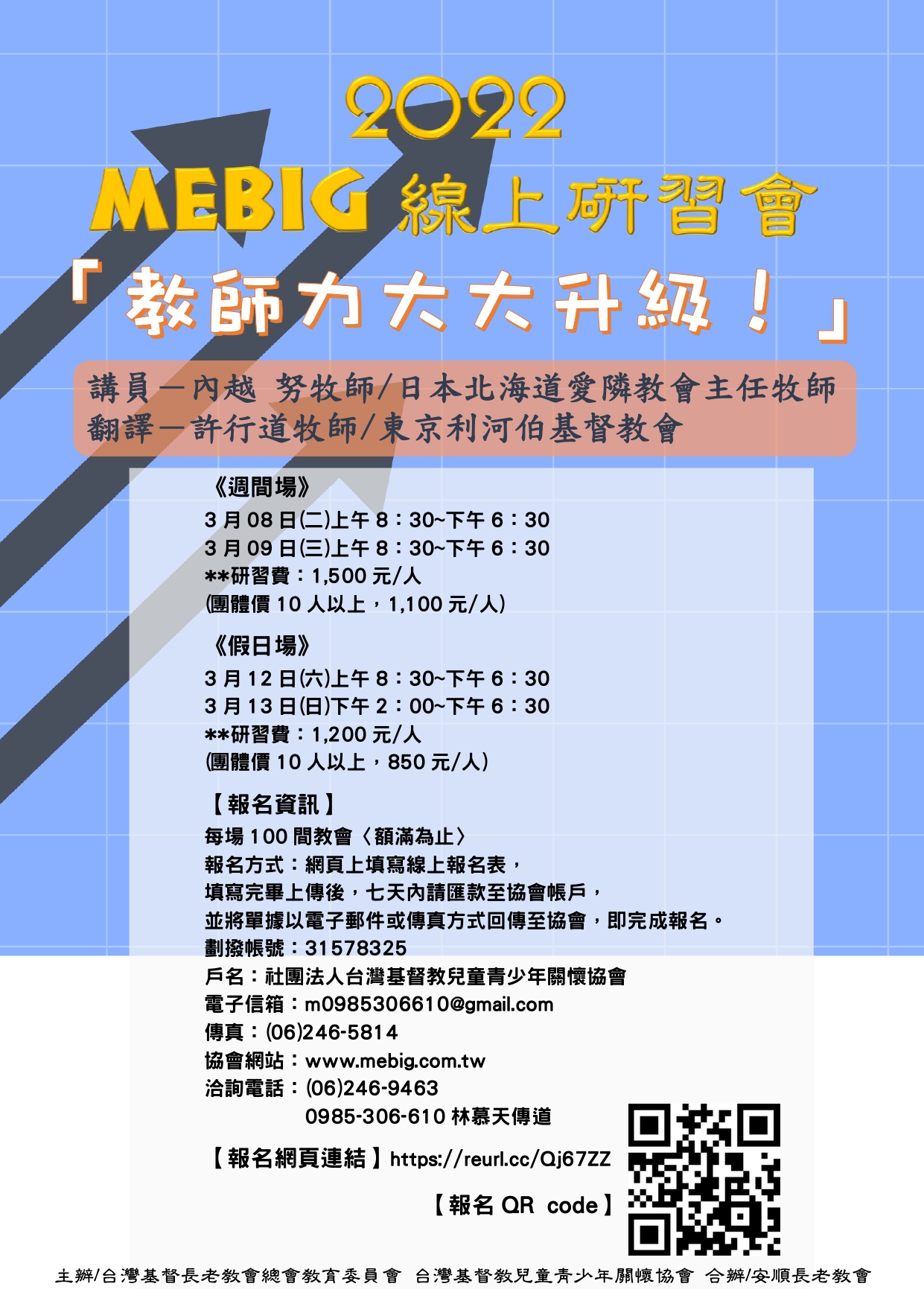2022「MEBIG線上研習會」 (一)主辦單位:台灣基督長老教會教育委員會、台灣基督教兒童青少年關懷協會 (二)研習主題:教師力大大升級! (三)講師:內越 努牧師/日本北海道愛隣教會 〔翻譯:許行道牧師/東京利河伯基督教會〕 (四)場次、日期、費用: 週間場 日期:2022年3月8日(二) 08:30-18:30 ~ 3月9日(三) 08:30-18:30 費用:每名1,500元。(團體價10人以上,每名1,100元) 假日場 日期:2022年3月12日(六) 08:30-18:30 ~ 3月13日(日)14:00-18:30 費用:每名1,200元。(團體價10人以上,每名850元) (五)報名時間及繳費方式: 請詳閱下載附件公函及活動廣告單,報名網頁連結https://reurl.cc/Qj67ZZ