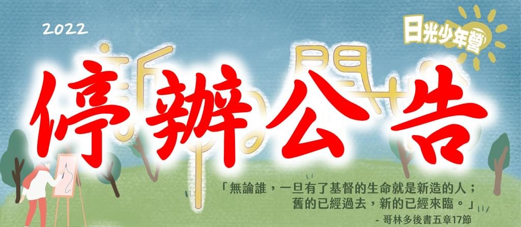 2022年日光少年營,原定2月6日(週日)至2月9日(週三)於桃園青年體驗學習園區舉行,因疫情急速升溫,加上內政部1月22日(六)宣佈「停辦易聚集擁擠人潮且難以維持社交距離之宗教活動」,有鑑於日光少年營內容為體驗教育,有許多肢體碰觸的活動、難以維持社交距離,因此決定宣佈停辦,並全額退費(手續費由總會吸收),造成各位學員、同工及家長諸多困擾與不便,敬請見諒。 已報名並完成繳費的學員,請於2月13日(週日)前,線上填寫退費資訊 https://forms.gle/xxGhnX6H6AqGtEhX8 ,或是將「報名者姓名、聯絡電話、受款銀行/郵局、銀行分行/郵局名稱、受款戶名、受款帳號」Email至terry131512@mail.pct.org.tw 同時因應活動的取消,總會青年事工委員會改為舉辦日光少年營線上活動,將於在2月7日(一)及2月8日(二)下午13:30~16:00舉辦,內容會有福音歌曲分享、線上互動遊戲、福音魔術教學,因線上系統有人數限制,因此只開放給有報名2022日光少年營的同工學員們參加,若有興趣的人,請於2月3日(四)前填寫表單報名 https://forms.gle/zsgdKA6LyFHzVtnx9 有任何的問題,歡迎來電或寫Email詢問我們。 台灣基督長老教會總會青年事工委員會 日光少年營 營 長 李信仁牧師 事工助理 許台立先生 電 話 02-23625282 轉 211 傳真電話 02-23631722 聯絡地址:(106613)台北市大安區羅斯福路三段269巷3號 主後 2022 年 1 月 22 日