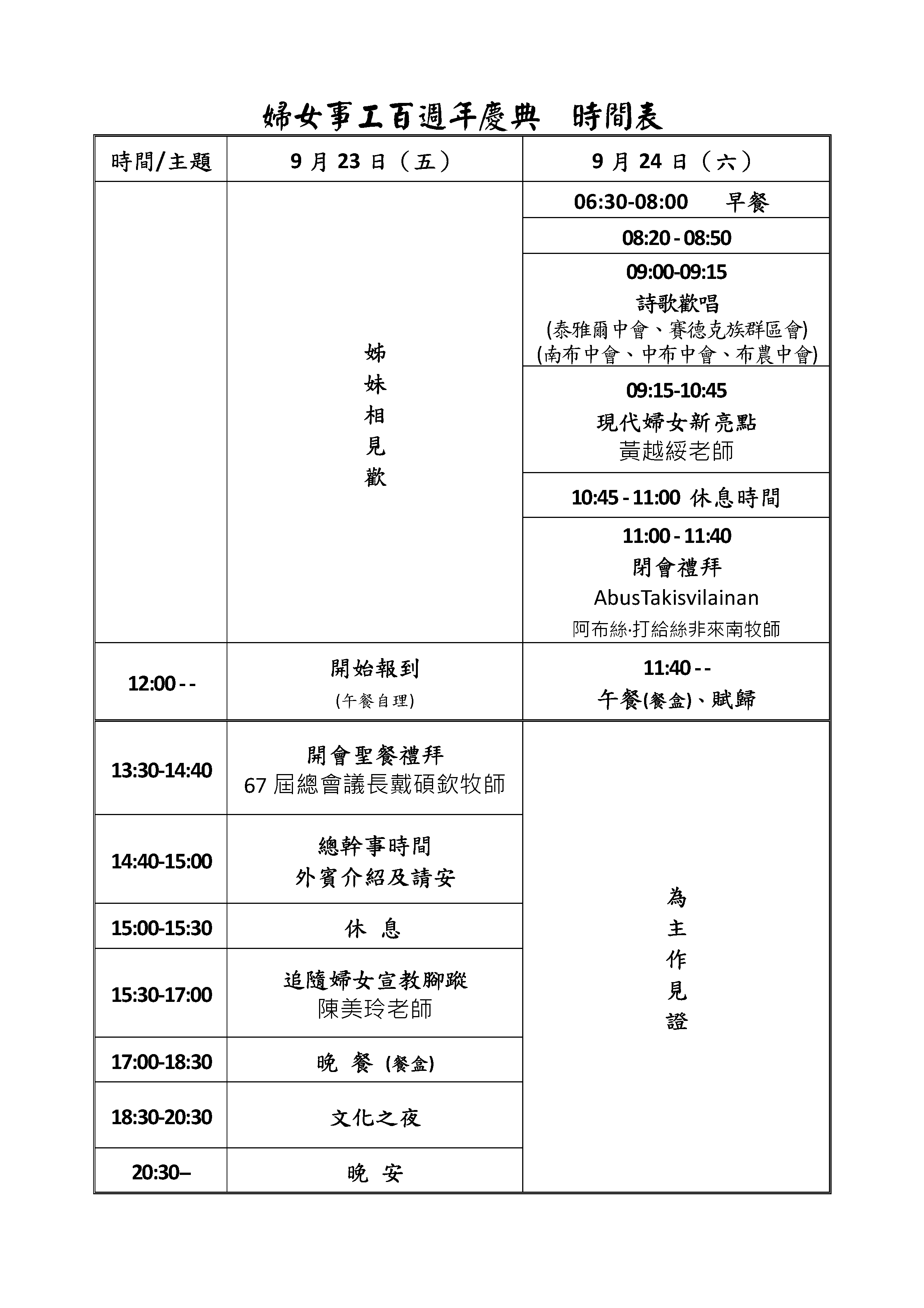 婦女事工百週年慶典 [婦女事工百週年.再創新亮點] 1922年11月,加拿大宣教師安義理姑娘成立北部女宣道會,開始台灣基督長老教會婦女宣教組織化;1929年在高潘筱玉女士促成南部女宣道會;1959年南北女宣道會合一成立女宣道處,隸屬總會。2022年婦女事工已邁入一百年。 時間:2022年9月23-24日(禮拜五-六) 地點:台南虹韻文創中心(台南市南區新忠路14號,06-2649539) 對象:全國教會婦女。 人數限制:750人,額滿為止。 報名費用:每人1000元(住宿費另計),住蘭嶼、澎湖、金門及馬祖500元(住宿費另計) 報名截止:6月30日(四)止。(以收到報名費為完成報名手續) 活動相關資料請簡章、時間表、報名表和住宿報名表, 若有未盡事宜,請洽總會婦女助理02-2362-5282#350 劉秋君、250 蔡孟潔。  |