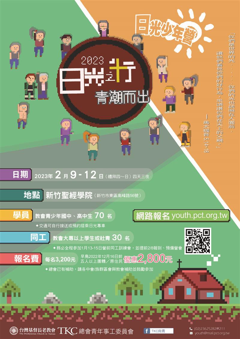 | 2023年日光少年營「日光之行 青潮而出」你們是世界的光。建造在山上的城是無法遮蓋起來的。沒有人點亮了燈去放在斗底下,一定是放在燈臺上, 好照亮全家的人。同樣,你們的光也該照在人面前, 讓他們看見你們的好行為,來頌讚你們在天上的父親。 ─馬太福音5:14~16