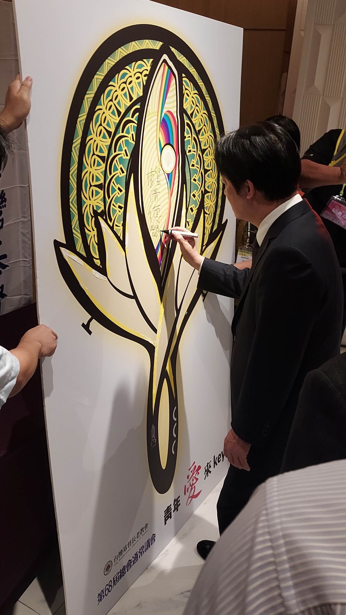 副總統賴清德在青年宣教看板上簽名(許台立攝) 即將代表民進黨參選2024總統的副總統賴清德先生,下午3時出席「台灣基督長老教會第68屆總會通常議會」向國內外來賓請安。進場前,賴副總統特別在大會所準備的青年宣教看板上簽名。總會議長戴碩欽牧師介紹賴清德上台致詞時表示,賴副總統是台灣未來的希望,也是台灣民主自由的奇蹟,「是我們心之所向,台灣之光、誰與爭鋒」。 賴副總統致詞時,感謝長老教會100多年來貢獻台灣及付出,包括透過教會宣教安撫民心、透過教育提高台灣知識水平及以醫療照顧弱勢。他注意到長老教會今年以「傳承上帝國、塑造新秩序」為目標,要傳承公義、和平與喜樂,並透過各種方式協助年輕人築夢踏實,他要代表蔡總統跟國家表達由衷感謝。 賴清德認為,先有公義後有和平,然後才有喜樂,公義就是公平正義,在政治、社會、經濟等面向人人平等,不因為身分、貧富貴賤、信仰而有任何不同,但這個目標也是經過幾十年、幾百年的努力才能達到,並藉由打造民主體制為途徑,從而達到自由、落實公義,進一步有和平可言,不只適用於個人,也適用於國家、社會、全世界。 賴清德指出,過去大家為了民主打拚,一路走過黨禁、報禁、總統直選、國會全面改選等,好不容易帶動台灣各項自由,但這個當下,不僅台灣,國際社會也面對極權主義的興起,與民主價值相違背,極權主義的獨裁體制下是沒有個人的,對內會遂行統治必要而打壓宗教自由,對外則遂行極權擴張影響國際社會。 賴清德表示,不管是不是教徒、信仰什麼宗教,都要有明確體認,現在是民主跟專制選擇的關鍵時刻,一定要持續發揮過去追求民主的精神,持續守護民主,才能建立公義、和平的社會,並進一步讓每個人達到喜樂的境界,非常希望能跟大家一起守護台灣,促進台灣的民主、和平跟繁榮,他要提出的具體作法,就是在拚經濟、顧民主、強國防、保和平。