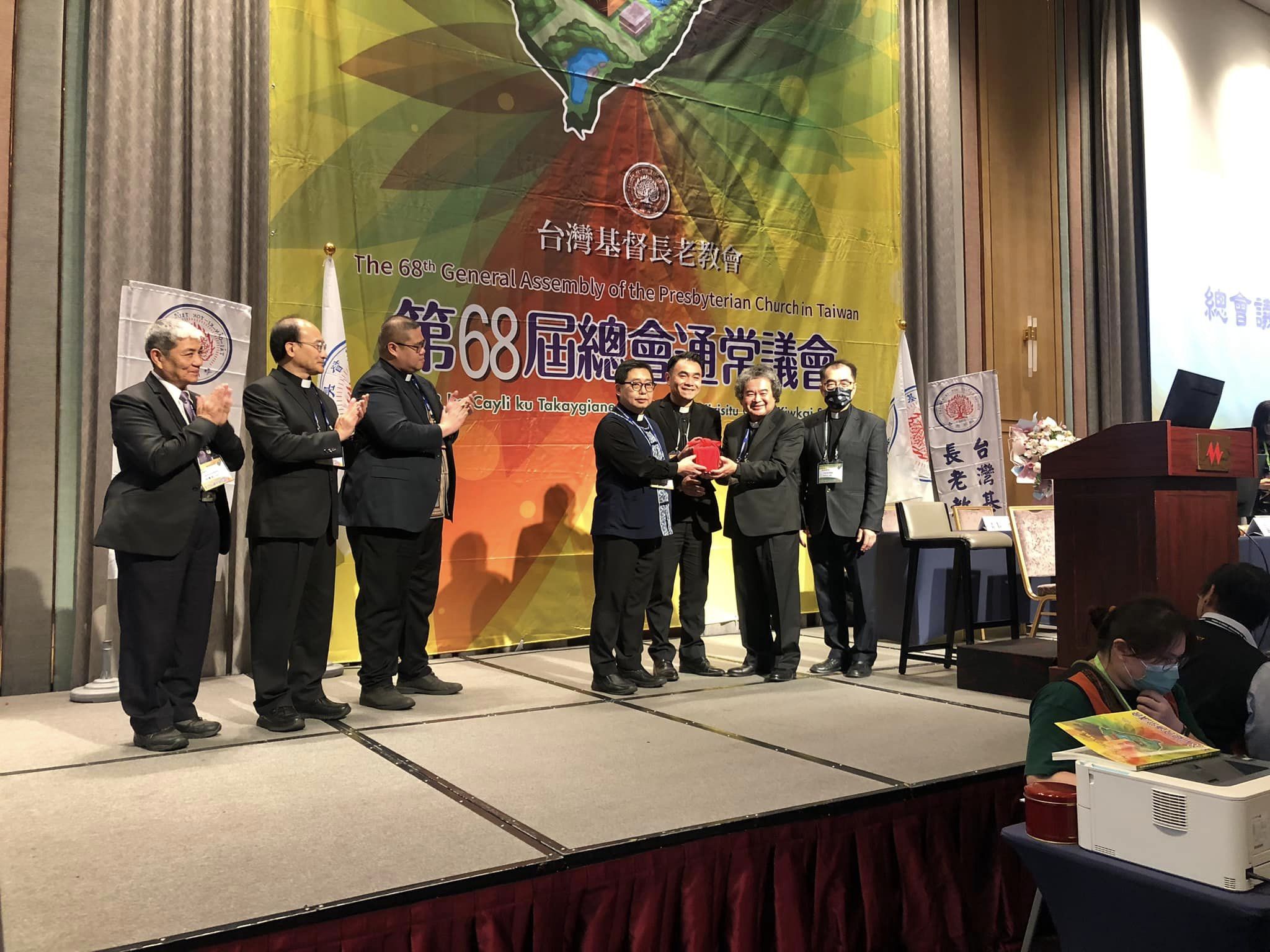 隨即在總會總幹事陳信良牧師主持、法規主委劉立仁牧師監交下,新任總會議長彭志鴻牧師從第67屆總會議長戴碩欽牧師手中接過總會議長印信完成交接儀式。