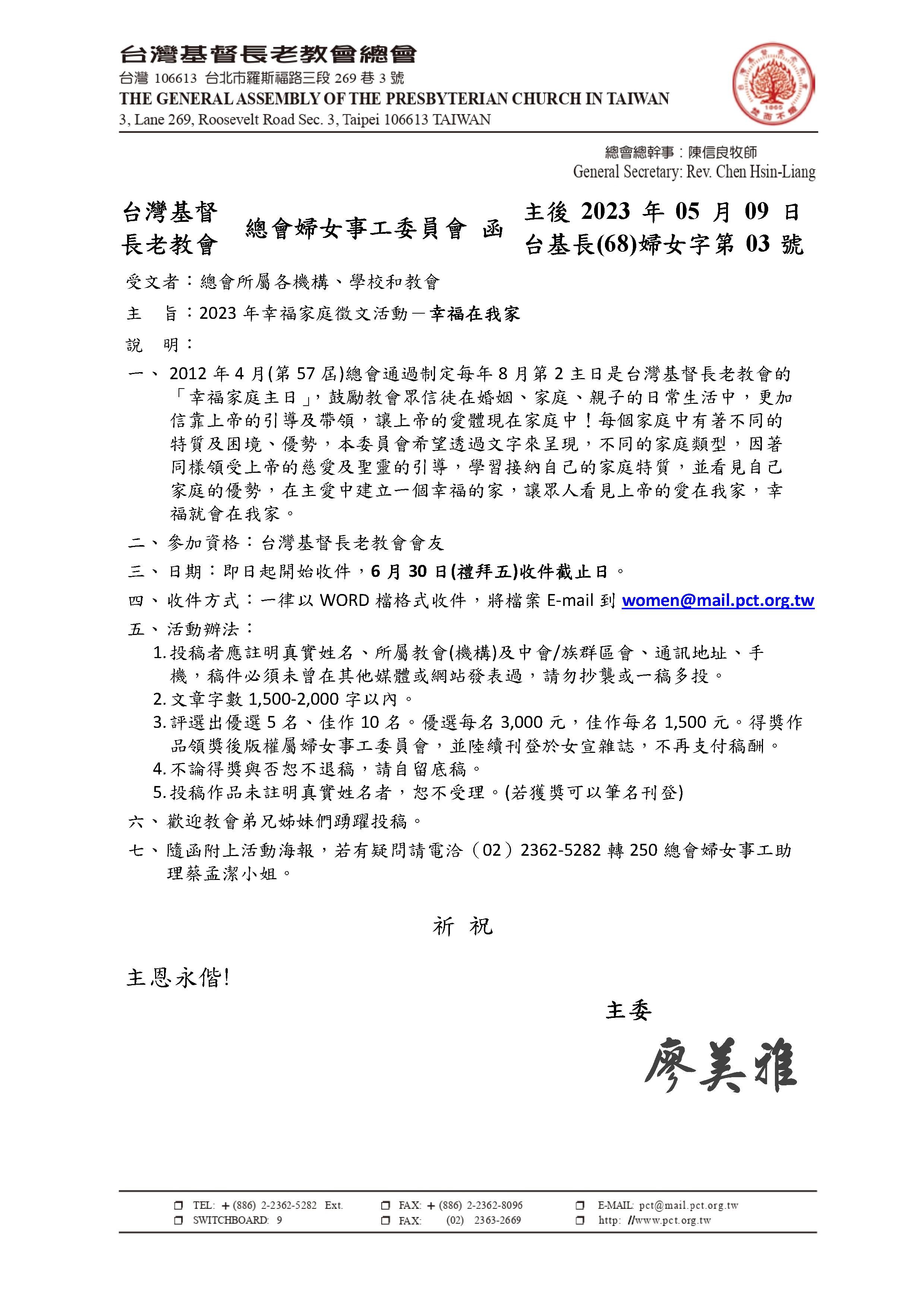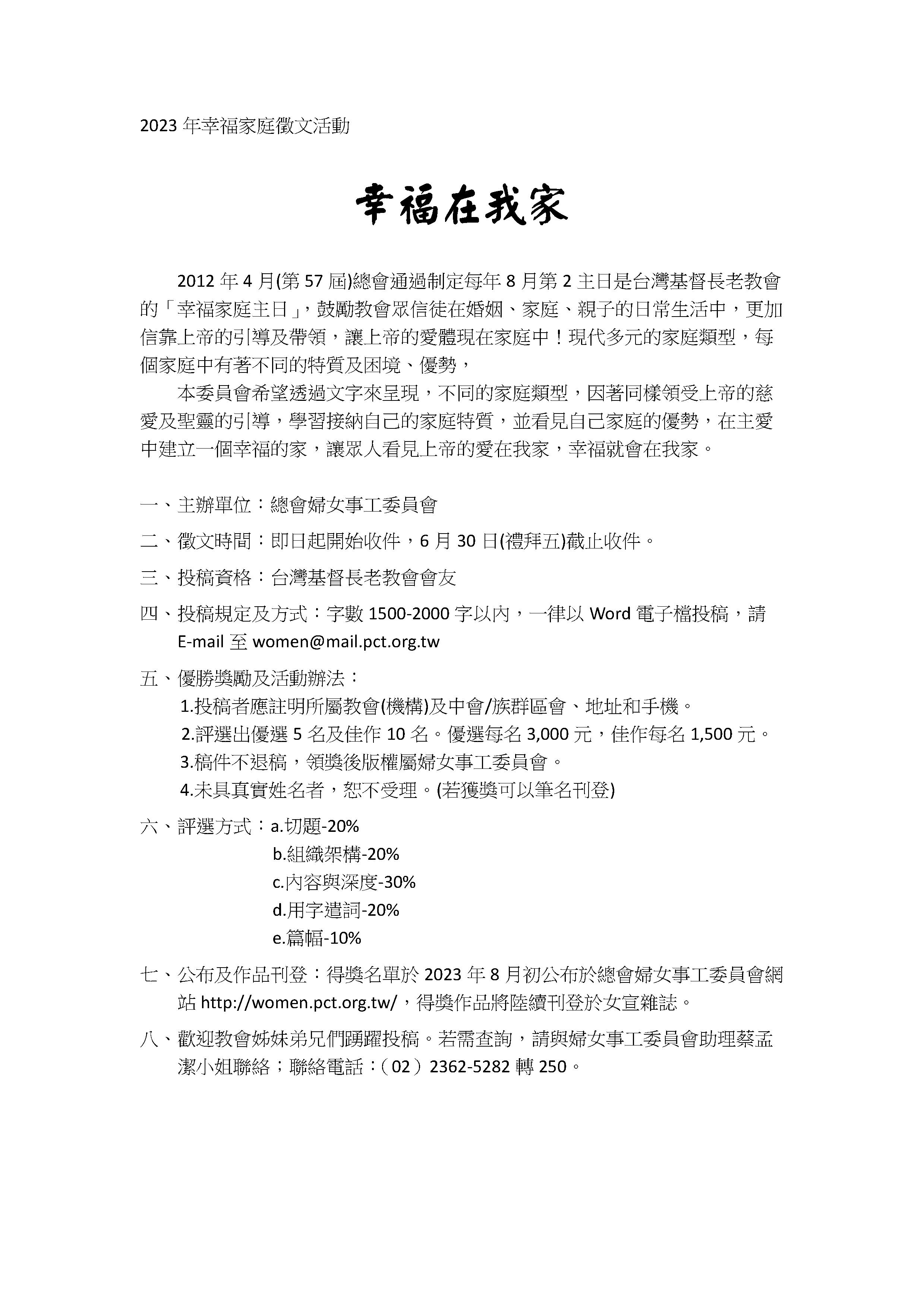 幸 福 在 我 家 2012年 4月 (第 57屆 )總會通過制定每年八月第2主日是 台灣基督長老教會的「幸福家庭主日」, 鼓勵教會眾信徒在婚姻、家庭、親子的日常生活中, 更加信靠上帝的引導及帶領,讓上帝的愛體現在家庭中! 每個家庭中有著不同的特質及困境、優勢, 本委員會希望透過文字來呈現,不同的家庭類型, 因著同樣領受上帝的慈愛及聖靈的引導, 學習接納自己的家庭特質, 並看見自己家庭的優勢, 在主愛中建立一個幸福的家, 讓眾人看見---- 上帝的愛在我家,幸福就會在我家。 ♦參加資格:台灣基督長老教會會友 ♦日期:即日起開始收件,截稿日期為6月30日(禮拜五)。 ♦收件方式:參賽作品以word電子檔格式投稿,將檔案E-mail至 ♦公布及作品刊登:得獎名單於2023年8月初公布於總會婦女事工委員會網站 ♦活動辦法: 1. 投稿者應註明真實姓名、所屬教會(機構)及中會、通訊處、電話。 稿件必須未曾在其他媒體或網站發表過,請勿抄襲或一稿多投。 2. 文章字數 1,500 - 2,000 字以內。 3. 評選出優選 5名、佳作 10名。優選每名 3,000元,佳作每名 1,500元。 得獎作品領獎後版權屬婦女事工委員會,並陸續刊登於女宣雜誌,不再支付稿酬。 4. 不論得獎與否恕不退稿,請自留底稿。 5. 投稿作品未註明真實姓名者,恕不受理。(若獲獎可以筆名刊登) 歡迎教會弟兄姊妹們踴躍投稿。 若有疑問請電洽(02)2362-5282轉250 婦女事工委員會助理蔡孟潔小姐查詢。