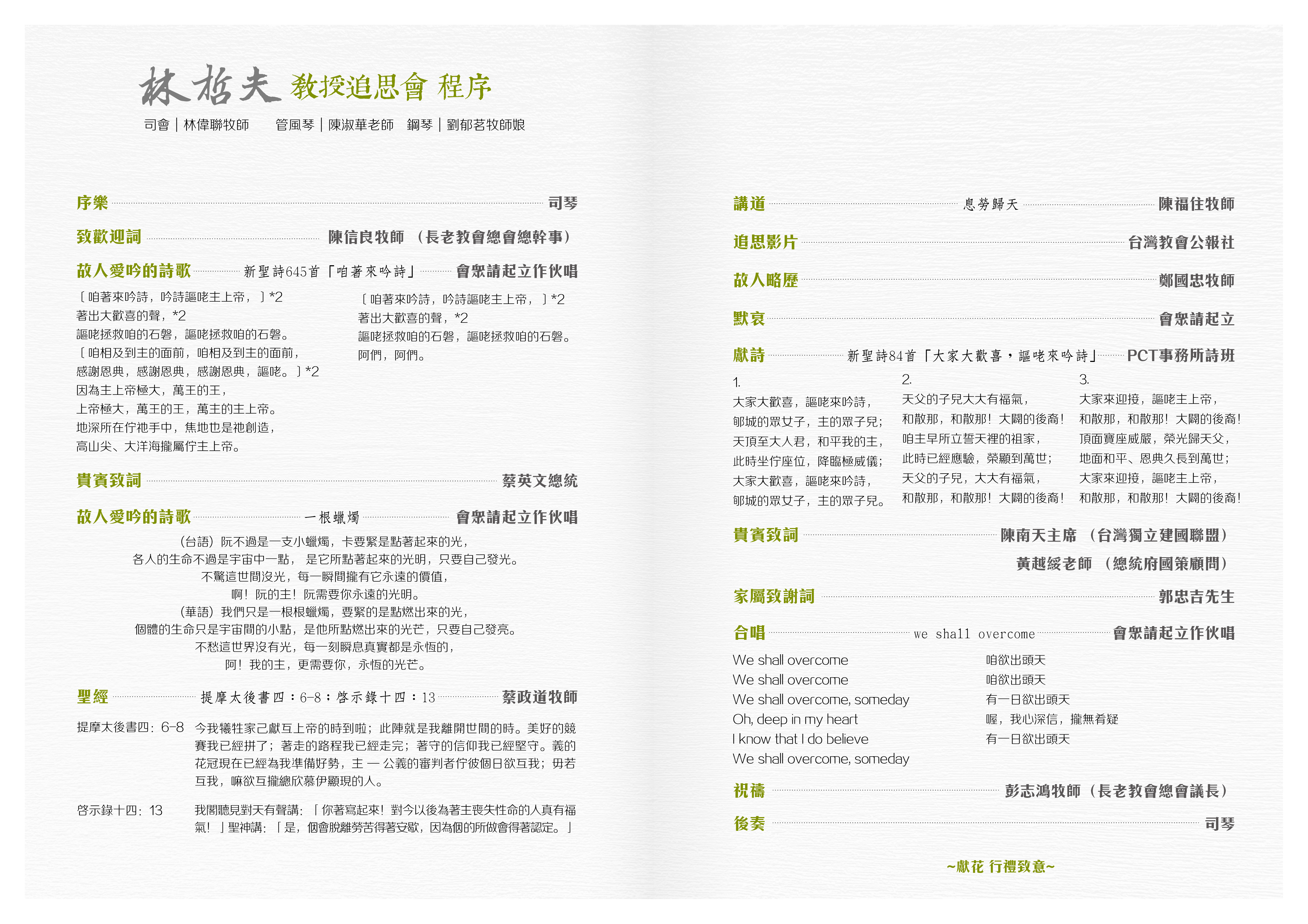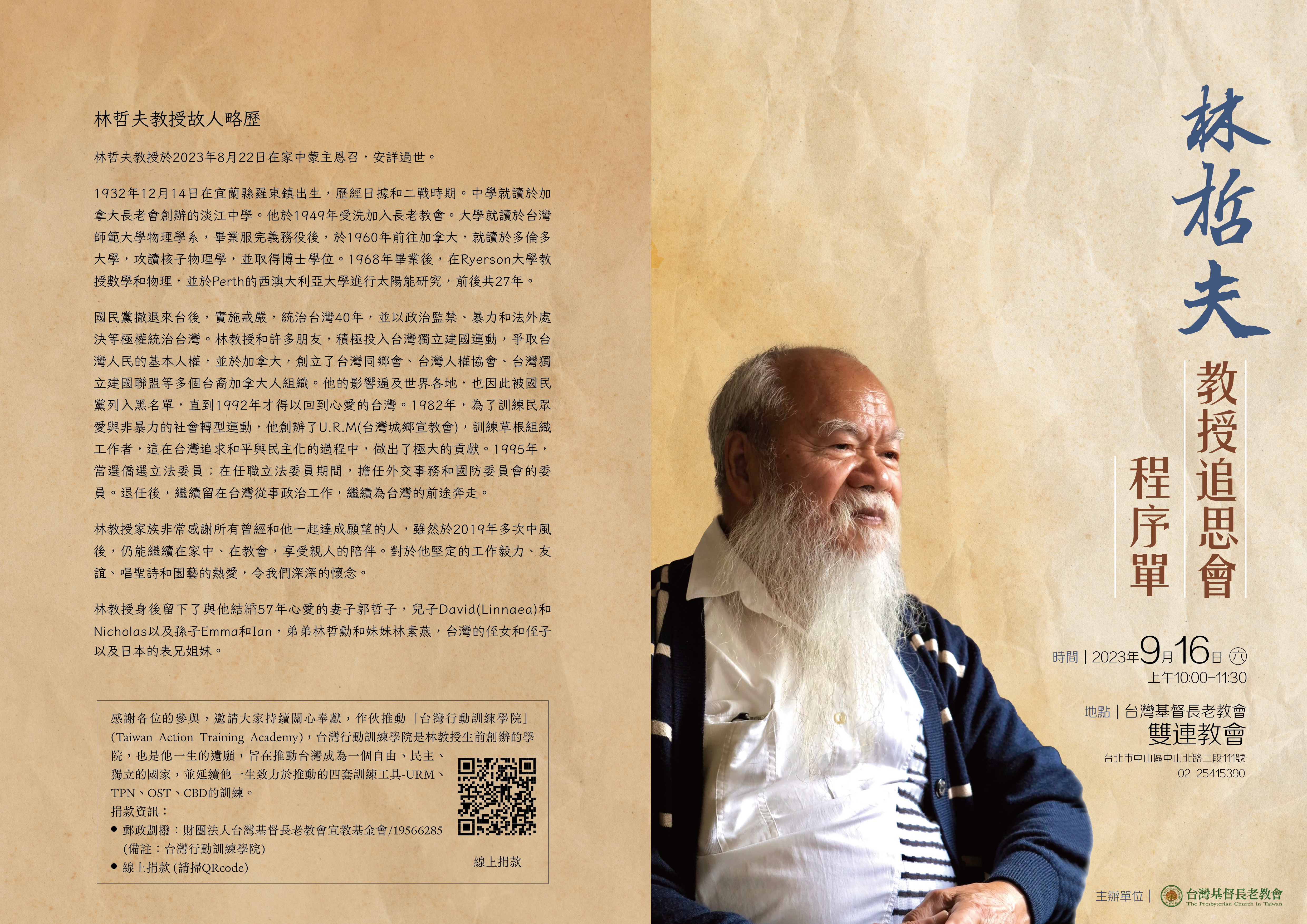 給關心台灣前途以及追求民主、自由先進的一封信: 親愛的朋友,台灣URM的開拓者-林哲夫教授,於2023年8月2 2日蒙主恩召,距生於1932年12月14日,享壽90歲。家屬決定於加東地區時間2023年9月2日禮拜六於加拿大多倫多舉行感恩與告別紀念禮拜。 為了感念林教授一生致力於台灣的民主、自由與獨立運動,在台灣我們將舉行三場紀念追思活動,時間地點如下: - 北區:9月16日(六)上午10:00,台灣基督長老教會雙連教會(地址:台北市中山區中山北路二段111號)。聯絡人:劉嘉芬小姐,電話:0989-976920。