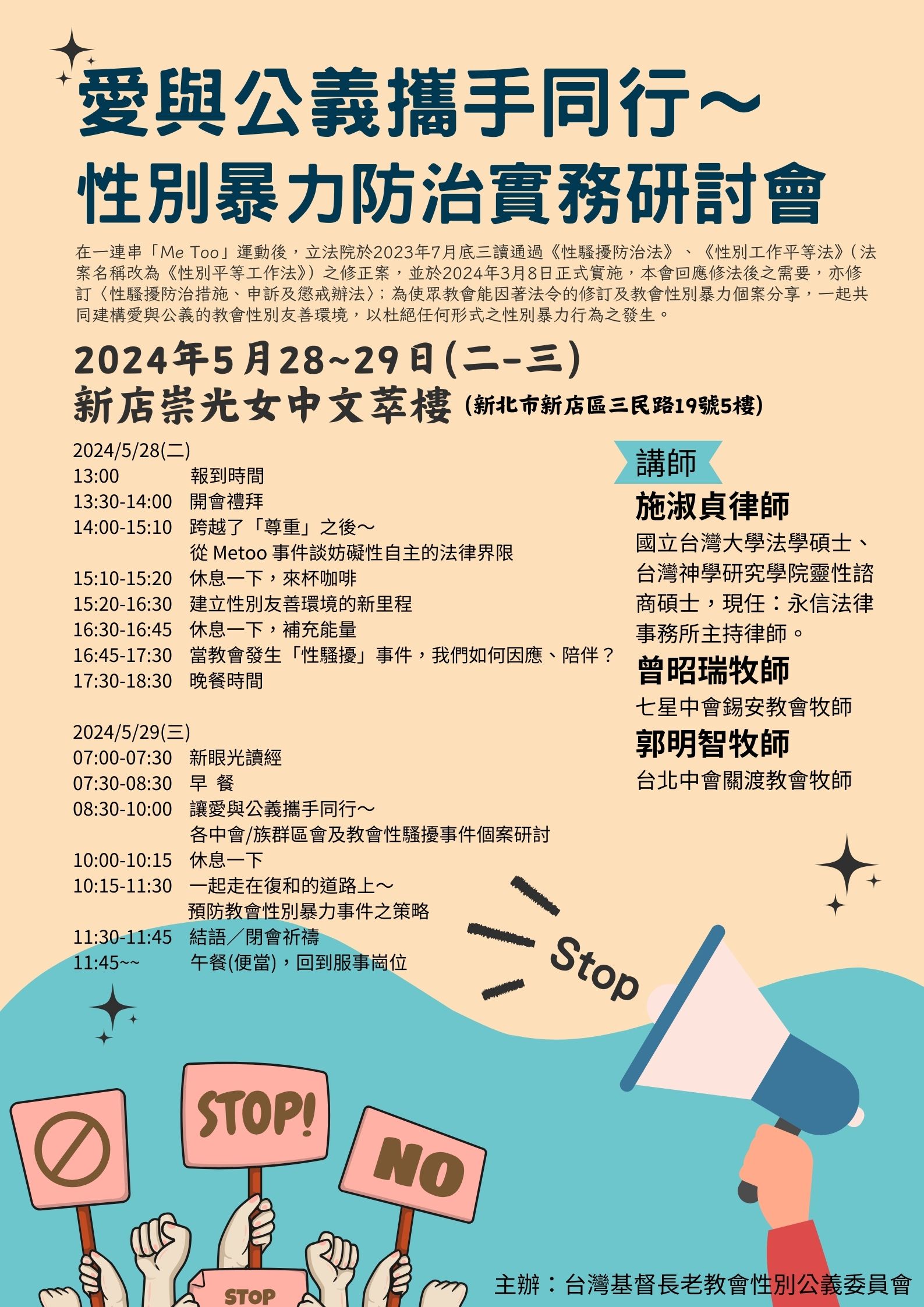 2024性別暴力防治實務研討會 愛與公義攜手同行 在一連串「Me Too」運動後,立法院於2023年7月底三讀通過《性騷擾防治法》、《性別工作平等法》(法案名稱改為《性別平等工作法》)之修正案,並於2024年3月8日正式實施,本會回應修法後之需要,亦修訂〈性騷擾防治措施、申訴及懲戒辦法〉;為使眾教會能因著法令的修訂及教會性別暴力個案分享,一起共同建構愛與公義的教會性別友善環境,以杜絕任何形式之性別暴力行為之發生。 日期:2024年5月28-29日(二~三) 地點:崇光女中文萃樓5樓(新北巿新店區三民路19號,02-29153318)。 對象:本會部長/部員/代表1-2名、傳道部、青年部、婦女事工部之代表。 費用:每名1,000元。(本會第69屆委員免費,但仍需報名)。