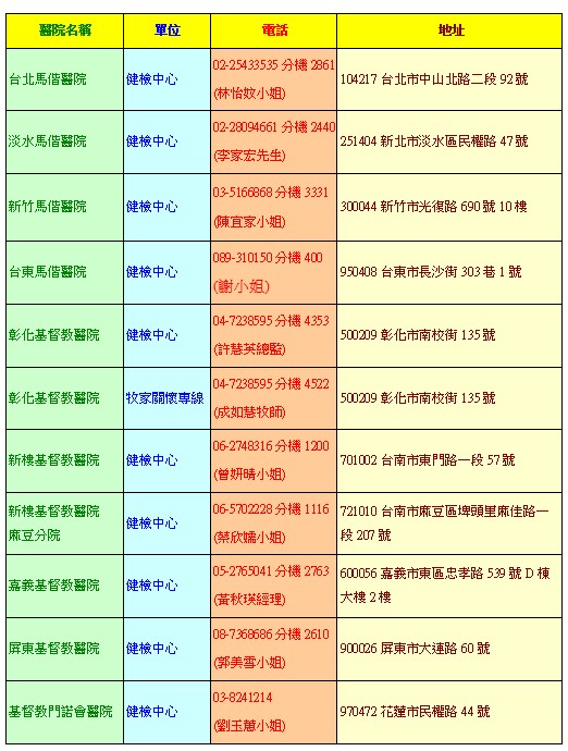 2024年已進入第二季,提醒具有健檢資格之牧者,儘快預約安排做健檢喔! 在其他沒有簽訂合約的醫院或健檢中心做檢查之牧者,也請將您的健檢報告影本、收據正本與存摺封面影本寄至傳福會請款。 2024年具健檢資格之條件如下: ●在職 1.2023年上、下半年傳福負擔金已繳交之牧者(含異動之牧者)。 2.2023年上、下半年傳福負擔金已繳交之牧者,但2024年無任職(含請 假、退休、退任)之牧者。(僅具有2024年度之健檢資格) ● 四十歲以上之牧者若合併兩年額度,其配偶可健檢一次;四十歲以下之 牧者為兩年健檢一次。 ※ 未參加傳福制度或未繳交傳福負擔金之牧者,本會不提供此項福利。 ●退休 六十五歲以上受本會安養關顧之牧者本人及配偶,每年健檢一次,兩年可 合併。 ~~~~~~~~~~~~~~~~~~~~~~~~~~~~~~~~ *牧者要向醫院預約健檢時,可先行與傳福會同工查詢相關資訊。 聯絡電話:02-2362-5282 分機 331 林伯珊姐妹