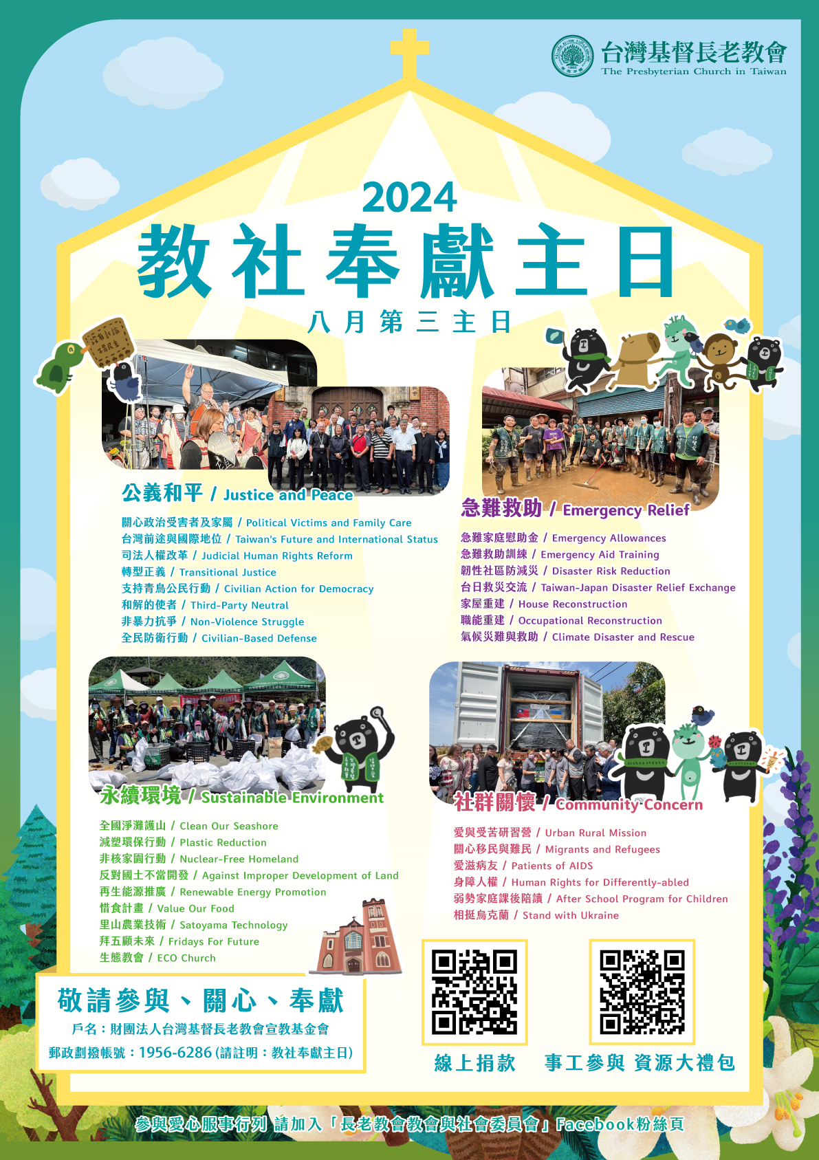 敬請各教會牧長、信徒關心8月18日(8月第三主日)今年度「教社奉獻主日」並為教社事工代禱及奉獻。 一、敬請各教會接受中會/族群區會安排交換講台或自行報告教社事工,並鼓勵信徒為事工經費關心奉獻。 二、本會受全體教會之託,致力於下列主要事工及計畫(從2023年7月起至2024年6月止): (一).公義和平: 1. 以正名、制憲、入聯路線,推動台灣成為新而獨立的國家。 2. 關心政治受害者及家屬,辦理相關追思紀念會及聲援行動。 3. 強化居住正義與就業安全,關心國人基本人權中生存權及就業權問題。 4. 推動轉型正義、司法改革等人權事工,紀念世界人權日(12/10)。 5. 反對國會濫權-青鳥公民行動。 6. 辦理及推廣社會行動培訓事工如;和解的使者(TPN)、非暴力培訓(NVS)、全民防衛(CBD)等。 (二)永續環境: 1. 推動非核家園,重申反核宣言,與反核團體合作辦理相關活動。 2. 推動「減塑環保行動」、「惜食計畫」。 3. 鼓勵各中會/族群區會分區辦理「全國淨灘護山」活動。 4. 推廣再生能源,鼓勵教會裝設再生能源設施。 5. 關注生態永續,反對國土不當開發。 6. 倡議里山農業技術(Satoyama),促進共融友善耕作。 7. 響應「拜五顧未來」(Fridays For Future)行動,加入ECO Church行列。 (三).急難救助: 1. 受理各中會/族群區會教社部及普世教會轉介急難救助個案申請。 2. 辦理跨機構急難救助合作事工,強化地區資訊交流與合作。 3. 不定期舉辦急難救助訓練;防災、減災訓練,建立韌性部落/社區。 4. 與慈善團體共同推動家屋重建方案,照顧受災及弱勢家庭。 5. 捐助普世合作教會進行救災工作(日本能登地震、土耳其地震、印尼蘇拉威西海嘯等),派遣義工前往災區進行家園重建。 6. 台灣氣候災難與救助,例如:卡努風災、海葵風災、0403花蓮地震等。 (四).社群關懷: 1. 設立關懷愛滋主日(12月第一主日),紀念國際身心障礙者日(12月3日)。 2. 舉辦愛與受苦研習營(URM),強化社區組織人才培訓。 3. 關心移民與難民,投入人道救援與輔導機制,參與推動難民法立法。 4. 爭取公、私部門資源來協助地方教會進行弱勢家庭課後陪讀。 5. 相挺烏克蘭,派遣醫療團前往義診,捐贈人道物資及救災車輛。 四、邀請大家參與教社事工,關心、奉獻!願上帝祝福我們所做的事工! 五、參與改造社會、愛心服事、關懷受造界行列,請成為長老教會教會與社會委員會Facebook專頁粉絲,按讚追蹤最新事工消息。 六、交換講台事宜請聯繫各中會/族群區會教社部長。其他問題,請聯絡: 總會教社委員會,02-2362-5282;幹事林偉聯牧師,分機155;助理劉嘉芬姐妹,分機255。教社電子信箱:society@pct.org.tw 奉獻資訊: 1.郵政劃撥:1956-6285 《通訊欄備註:教社主日》戶名: 財團法人台灣基督長老教會宣教基金會 2.線上捐款: