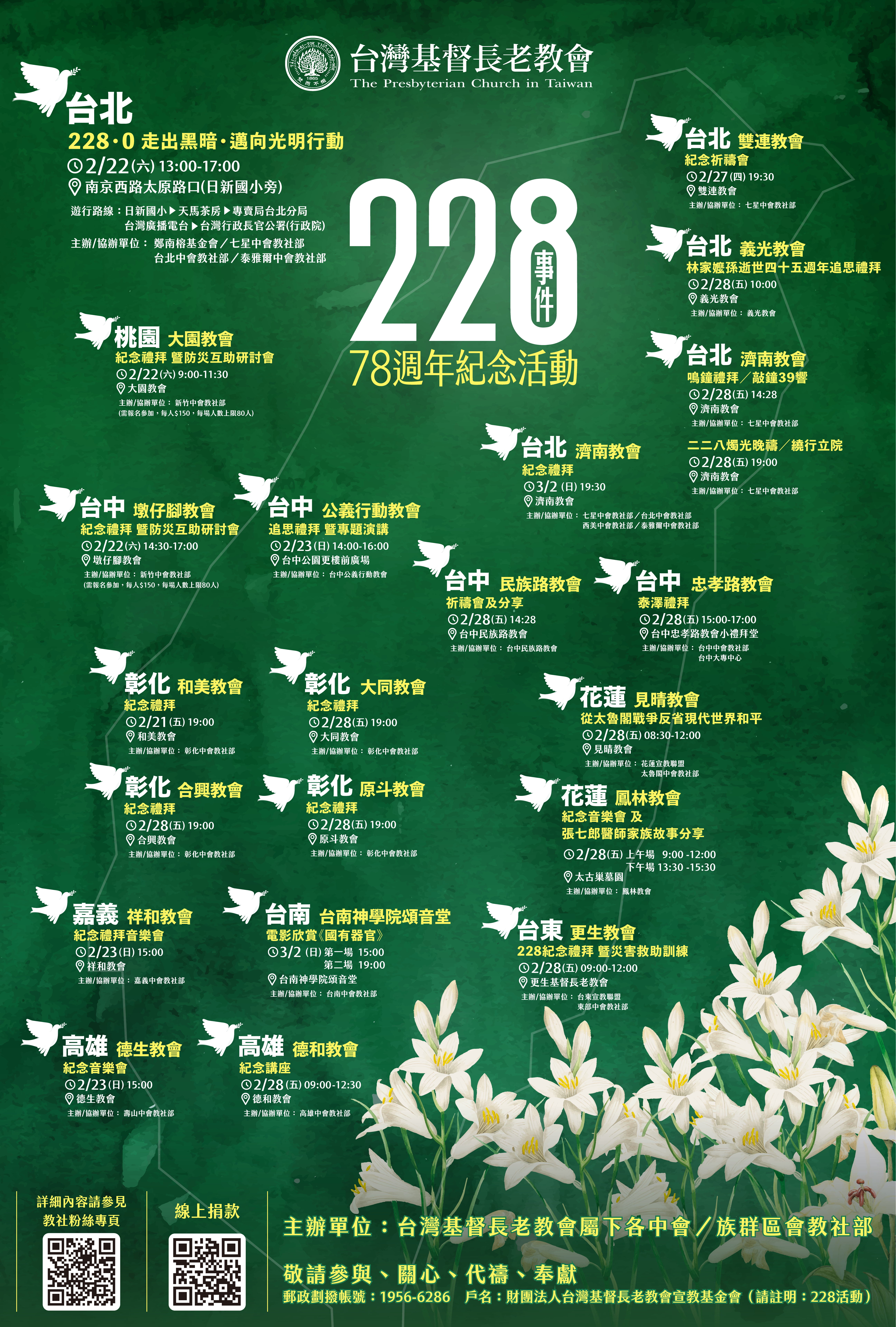更新日期:2025/2/17 | 時間 | 地點 | 主題/內容 | 主辦/協辦單位 | 聯繫/備註 | | 2/21(五)19:00 | 和美教會 | 紀念禮拜 | 彰化中會教社部 | 彰化區 | | 2/22(六) 13:00-17:00 | 台北:南京西路太原路口(日新國小旁) | 228.0 行動/13:00 日新國小集合、14:28 天馬茶房起步 | 鄭南榕基金會/七星中會教社部/台北中會教社部/泰雅爾中會教社部 | https://www.facebook.com/1947Taioan228 | | 2/22(六) 9:00~11:30 | 大園教會 | 紀念禮拜,暨防災互助研討會 | 新竹中會教社部 | 需報名參加,1人150元,每場人數上限80人 | | 2/22(六) 14:30~17:00 | 墩仔腳教會 | | 2/23(日) 14:00-16:00 | 台中公園更樓前廣場 | 追思禮拜暨專題演講 | 台中公義行動教會 | | | 2/23 (日)15:00 | 祥和教會 | 紀念禮拜音樂會 | 嘉義中會教社部 | | | 2/23 (日)15:00 | 德生教會 | 音樂會 | 壽山中會教社部 | | | 2/27(四) | 基隆海洋廣場 | 228受難家屬禮拜 | | | | 2/27(四)19:30 | 雙連教會 | 紀念祈禱會 | 七星中會教社部 | | | 2/28(五) 9:00-12:30 | 德和教會 | 紀念講座/今日社會中兩個和平議題~職場霸凌與校園霸凌 | 高雄中會教社部 | | | 2/28(五)14:28 | 台中民族路教會 | 祈禱會及分享 | 台中民族路教會 | | | 2/28(五) 15:00-17:00 | 台中忠孝路教會小禮拜堂 | 泰澤禮拜 | 台中中會教社部台中大專中心 | | | 2/28(五) 8:30-12:00 | 見晴教會 | 從太魯閣戰爭反省現代世界和平 | 花蓮宣教聯盟 太魯閣中會教社部 | | | 2/28(五) 上午場9:00-12:00 | 鳳林太古巢墓園 | 紀念音樂會及張七郎醫師家族故事分享 | 鳳林教會 你說說工作室 | | | 2/28(五) 下午場13:30-15:30 | 鳳林教會 | 單車走讀 | | 2/28(五) 9:00-12:00 | 更生教會 | 228紀念禮拜暨災害救助訓練 | 東部中會教社部 台東宣教聯盟 | | | 2/28(五)14:28 | 濟南教會 | 鳴鐘禮拜/敲鐘39響 | 七星中會教社部 | | | 2/28(五)19:00 | 濟南教會 | 二二八燭光晚禱/繞行立院 | 七星中會教社部 | | | 2/28(五)10:00 | 義光教會 | 林家嬤孫逝世四十五週年追思禮拜 | 義光教會 | | | 2/28(五)19:00 | 合興教會 | 紀念禮拜 | 彰化中會教社部 | 溪湖區 | | 大同教會 | 員林區 | | 原斗教會 | 二林區 | | 2/28(五) 14:00-16:00 | 東門巴克禮紀念教會 | 用故事傳承勇氣,用畫筆描繪和平 | 台南中會教社部 東門巴克禮紀念教會 | | | 3/2(日)19:30 | 濟南教會 | 紀念禮拜 | 七星中會教社部 台北中會教社部 西美中會教社部 泰雅爾中會教社部 | | | 3/2(日) 第一場15:00第二場19:00 | 台南神學院頌音堂 | 電影欣賞:「國有器官」 | 台南中會教社部 | | | 3/4(二) 10:30-12:15 | 東門巴克禮紀念教會-伊莉莎白禮拜堂 | 「共產中國虛幻的宗教自由」新書發表座談會 講員:傅希秋牧師 | 台南中會教社部 | | 提醒事項: 1.以上由中會主辦之每場次皆提供基本100個百合徽章。 2.特別邀請全台各教會於2/28(三)下午2:28時,可用敲鐘的方式來紀念。敲鐘方式參考:可敲39響(按耶穌基督被釘上十字架前,依古羅馬帝國法律所受鞭打的次數),每響隔5秒,以紀念事件的受害者。有參與敲鐘的教會,可憑影音資料Email至society@pct.org.tw申請500元禮卷。 |