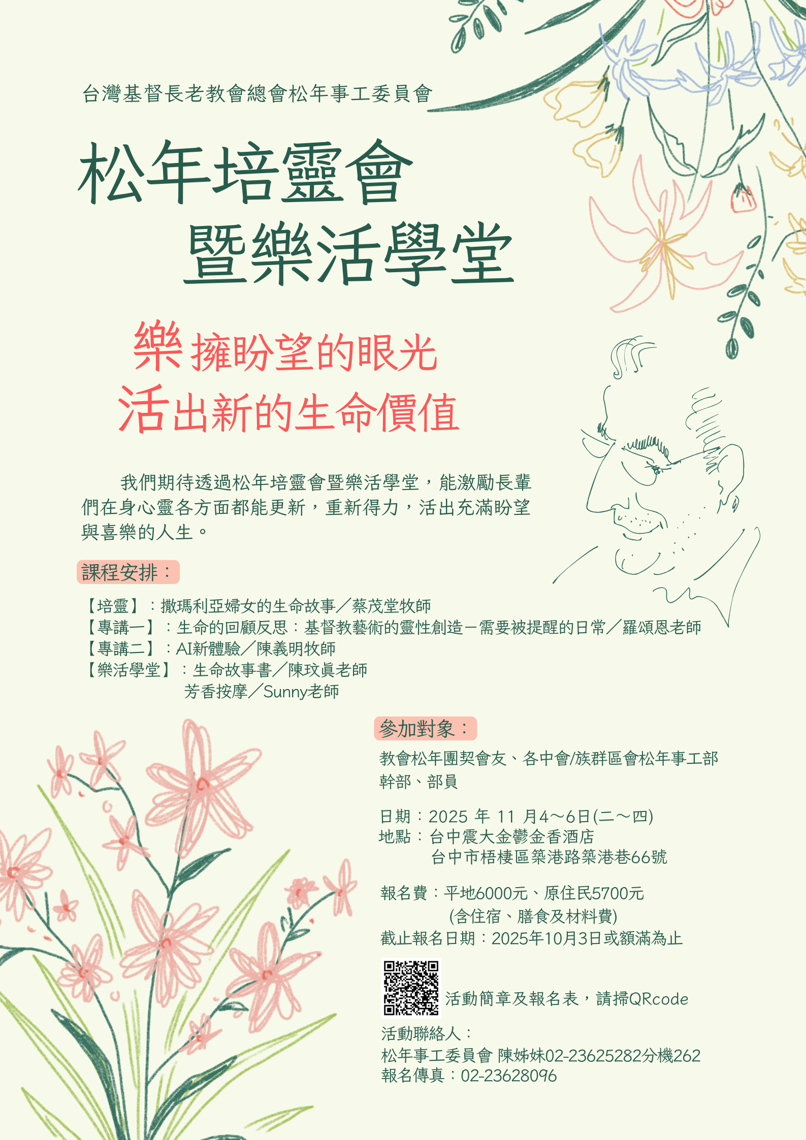 松年培靈會暨樂活學堂 在這個快速變動的世代,長者不僅承載著生命的智慧與豐富的信仰經驗,更是教會和家庭中不可或缺的祝福。聖經提醒我們:「義人要發旺如棕樹,生長如黎巴嫩的香柏樹。他們年老的時候仍要結果子,要滿了汁漿而常發青。」(詩篇 92:12-14)這是神對每一位長輩的美好應許──年歲不會使我們失去價值,反而讓生命更顯得豐盛。 因此,我們特別籌劃了這次 「松年培靈會暨樂活學堂」,盼望透過課程,能激勵長輩們在身心靈各方面都能更新,重新得力,活出充滿盼望與喜樂的人生。 📅 日期:2025年11月4-6日( 二-四 ) 📍 地點:台中震大金鬱金香酒店(台中市梧棲區築港路築港巷66號) 💌 報名方式:下載活動簡章及報名表,填寫後傳真或MAIL至松年委員會信箱 傳真:02-23628096 MAIL信箱:senior@mail.pct.org.tw