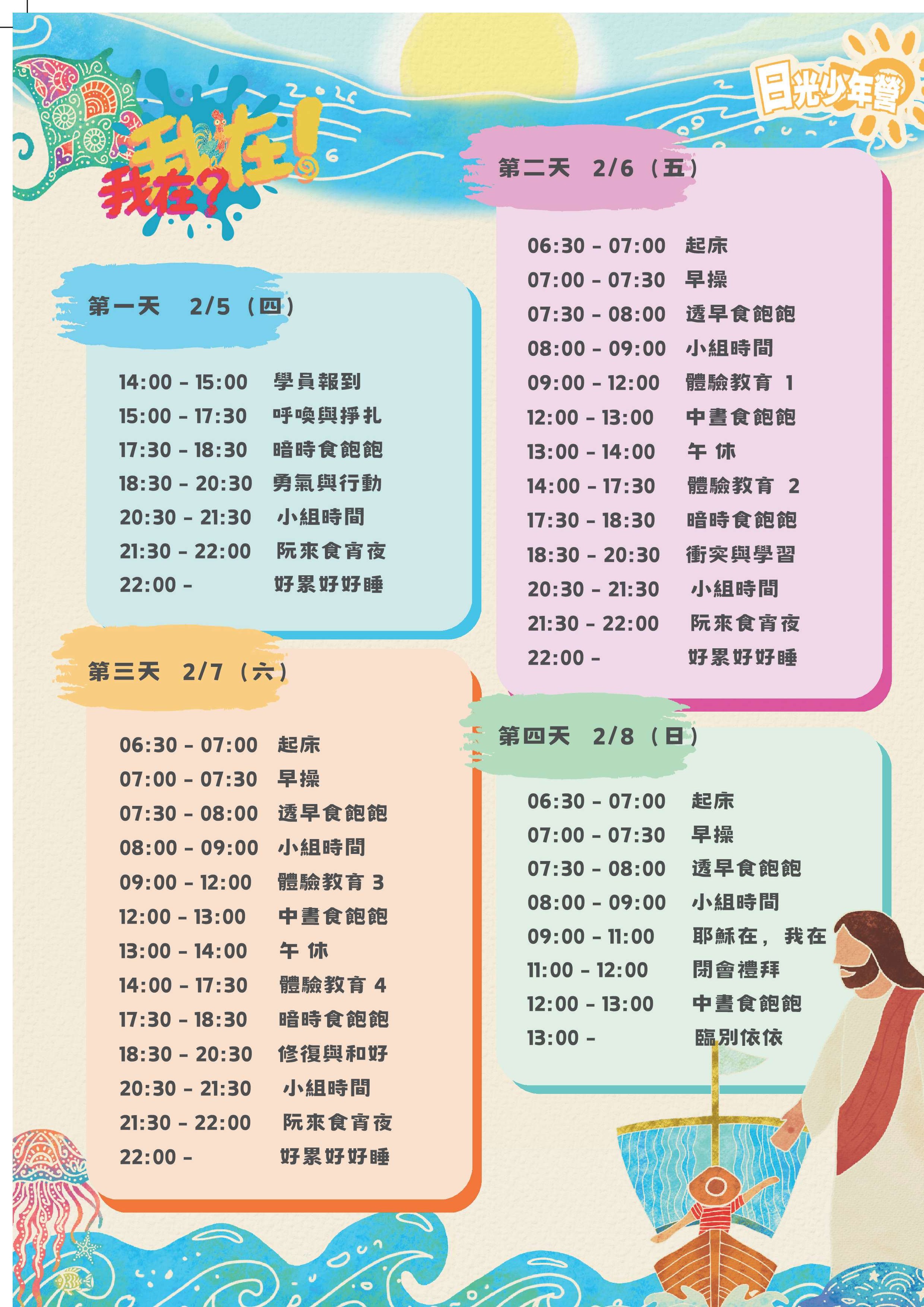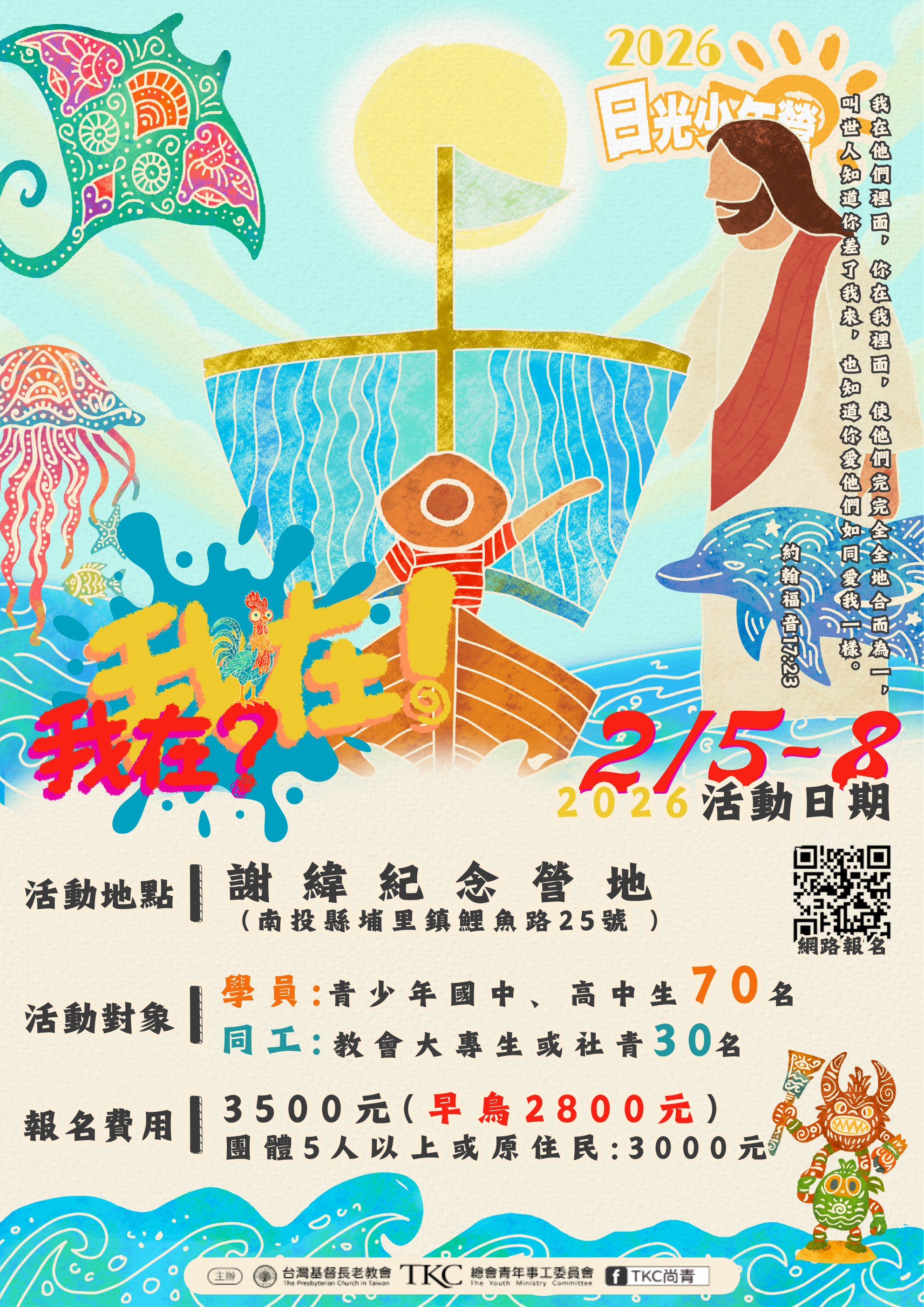 2026年日光少年營《我在?我在!》我在他們裡面,你在我裡面,使他們完完全全地合而為一, 叫世人知道你差了我來,也知道你愛他們如同愛我一樣。 (約翰福音17章23節) 邀請全台灣教會青少年參與,以體驗教育的方式,結合信仰反思的型態,鼓勵青少年與主連結,與耶穌成為至好朋友;為青少年建立信仰的根基、為教會培育門徒訓練的基礎。