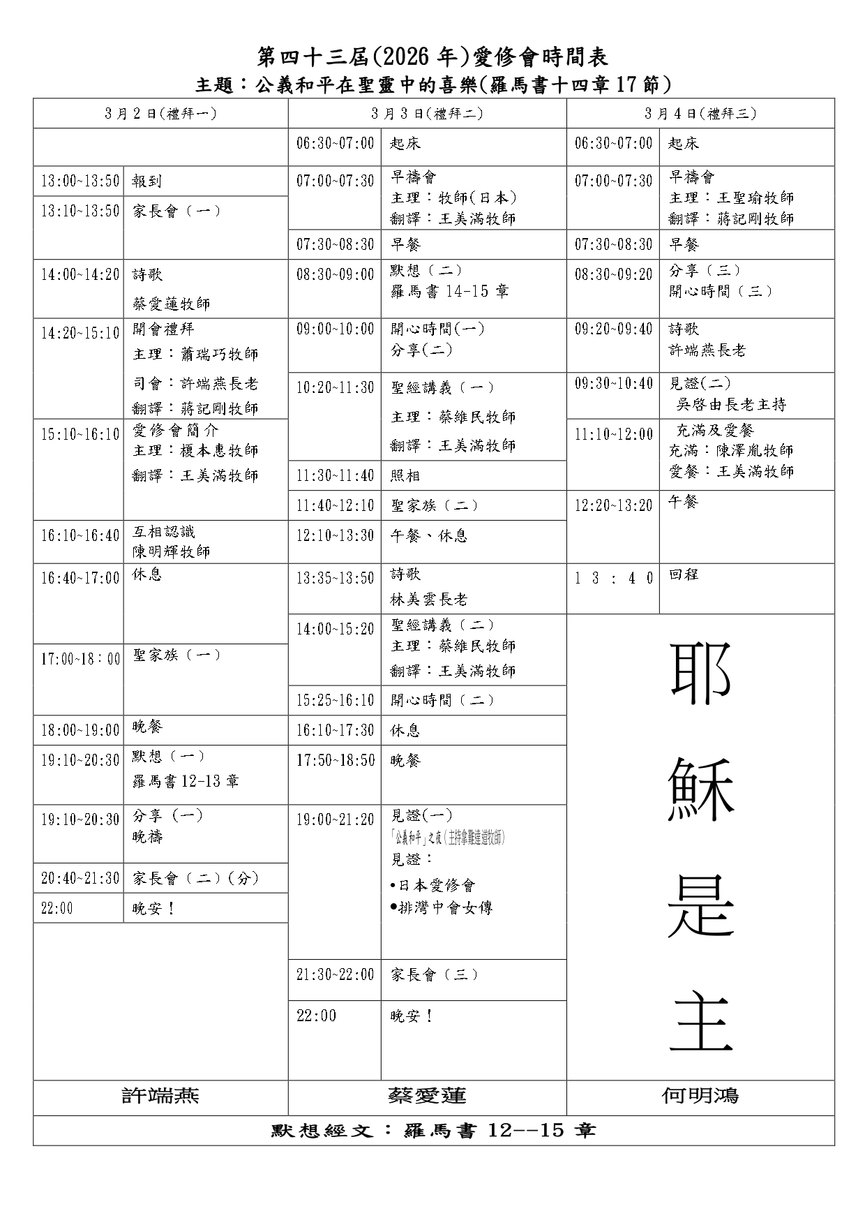 主題:公義和平在聖靈中的喜樂(羅馬書十四章17節)