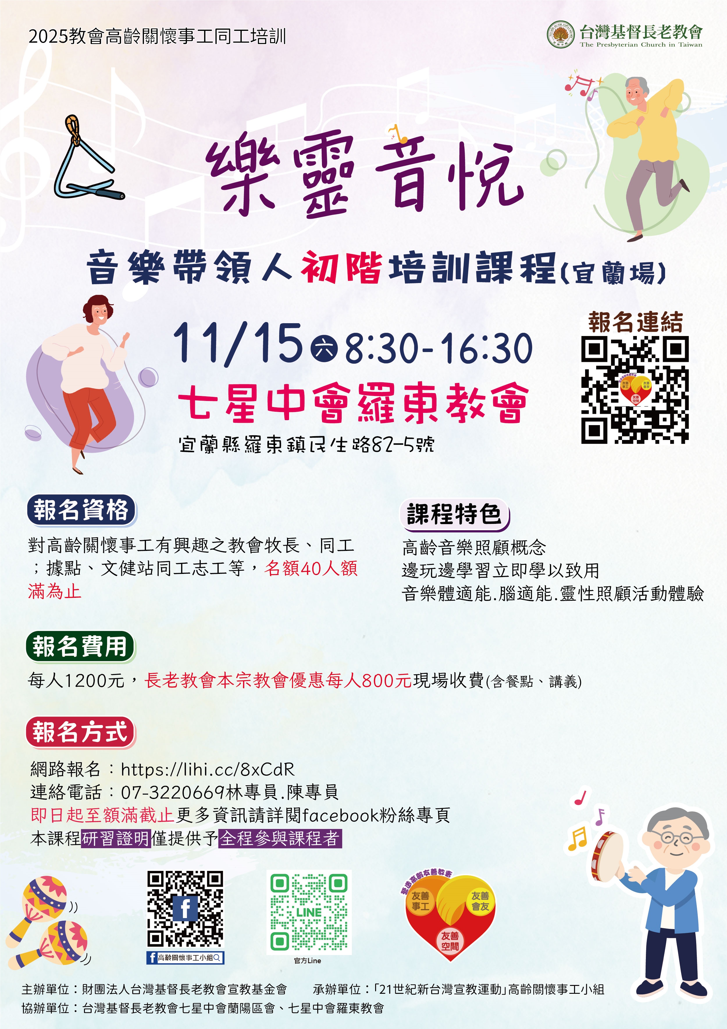 |報名期間:即日起至額滿為止 |報名資格: 1.對高齡關懷事工有興趣之教會牧長、同工、會友 2.據點、文健站同工(志工) |報名費用(現場收費): 每人1200元