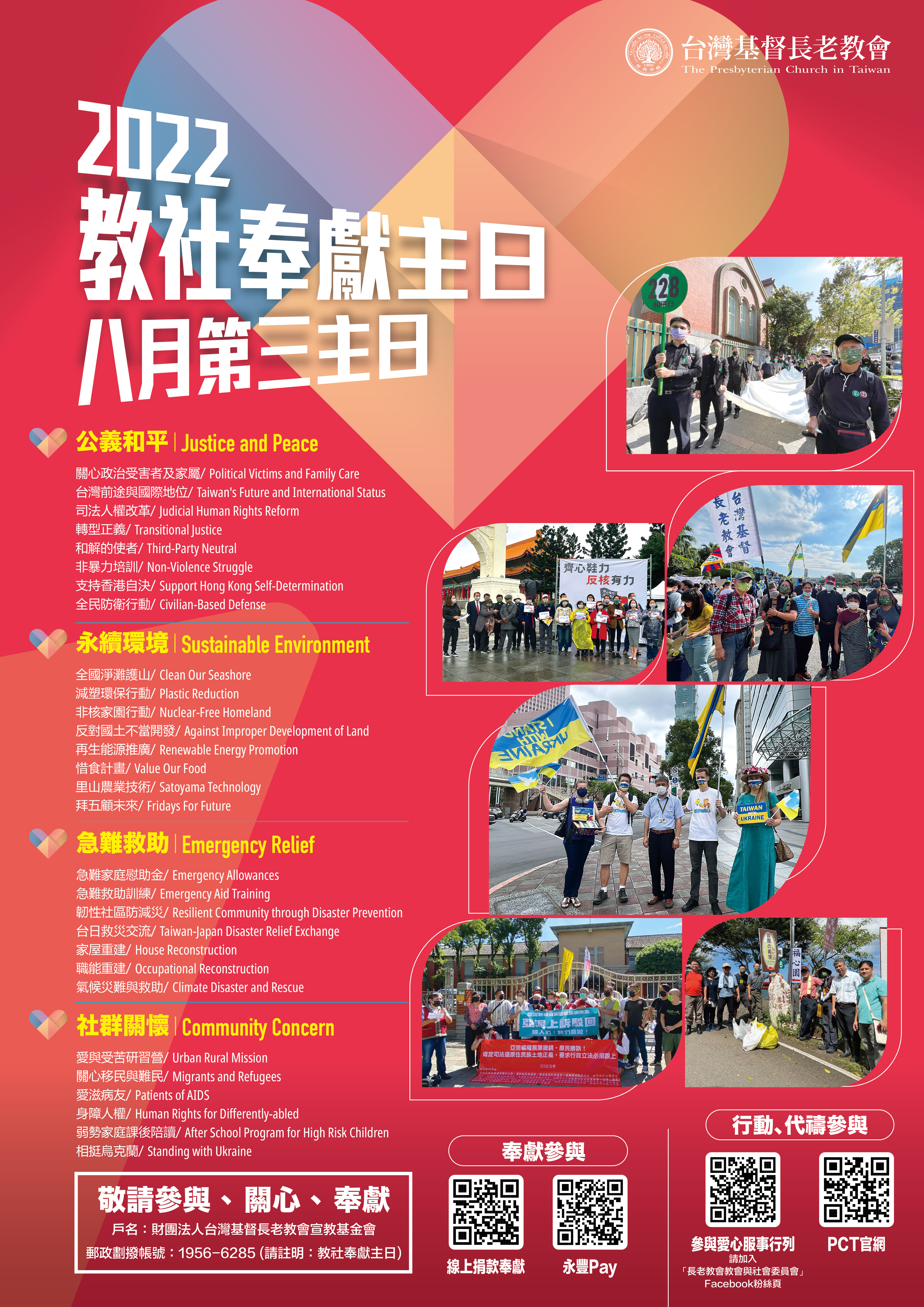 主 旨:敬請各教會牧長、信徒關心8月21日(8月第三主日)今年度「教社奉獻主日」並為我教會教社事工代禱及奉獻由。 附 件:參考講章、奉獻主日海報如下載。 說 明: 一、敬請各教會接受中會/族群區會安排交換講台或自行報告教社事工,並鼓勵信徒為事工經費關心奉獻。今年有製作教社事工影片歡迎使用:台語版https://youtu.be/dYGZJib5sV0,華語版https://youtu.be/Y9ccE3PGhIU。 二、本會受全體教會之託,致力於下列主要事工及計畫(從2021年8月起至2022年7月止): (一).公義和平: 1. 以正名、制憲、入聯路線,推動台灣成為新而獨立的國家。 2. 關心政治受害者及家屬,辦理相關追思紀念會及聲援行動。 3. 強化居住正義與就業安全,關心國人基本人權中生存權及就業權問題。 4. 推動轉型正義、司法改革等人權事工,紀念世界人權日(12/10)。 5. 持續鼓勵各中會/族群區會設立公義行動教會。 6. 辦理及推廣社會行動培訓事工如;和解的使者(TPN)、非暴力培訓(NVS)、全民防衛(CBD)等。 7. 聲援香港自決運動,與在台港生及NGO團體共同辦理相關活動。 (二)永續環境: 1. 推動非核家園,重申反核宣言,與反核團體合作辦理相關活動。 2. 推動「減塑環保行動」、「惜食計畫」,邀請全台教會、機構共同參與實踐垃圾減量減塑、珍惜食物。 3. 鼓勵各中會/族群區會分區辦理「全國淨灘護山」活動。 4. 推廣再生能源,鼓勵教會裝設再生能源設施。 5. 反對國土不當開發。 6. 倡議里山農業技術(Satoyama),還給土地一個和諧共融的新境界。 7. 響應「拜五顧未來」(Fridays For Future)行動。 (三)急難救助: 1. 受理各中會/族群區會教社部及普世教會轉介急難救助個案申請。 2. 辦理跨機構急難救助合作事工,強化地區資訊交流與合作。 3. 不定期舉辦急難救助訓練及防災、減災訓練,建立韌性部落/社區。 4. 與慈善團體共同推動家屋重建方案,照顧受災及弱勢家庭。 5. 鼓勵所屬醫院推動偏遠醫療及跨國義診,參與防疫救助事工。 6. 捐助普世合作教會進行救災工作,派遣義工前往災區進行家園重建,如日本、印尼、阿富汗、美國、緬甸、柬埔寨等。 (四)社群關懷: 1. 設立關懷愛滋主日(12月第一主日),紀念國際身心障礙者日(12月3日)。 2. 舉辦愛與受苦研習營(URM),強化社區組織人才培訓。 3. 關心移民與難民,投入人道救援與輔導機制,參與推動難民法立法。 4. 爭取公、私部門資源來協助地方教會進行弱勢家庭課後陪讀。 5. 相挺烏克蘭,辦理烏克蘭論壇、籌備家園重建義工團,與在台烏克蘭人團體共同辦理聲援活動。 四、邀請大家參與教社事工,關心、奉獻!願上帝祝福我們所做的事工! 五、參與改造社會、愛心服事、關懷受造界行列,請成為長老教會教會與社會委員會Facebook專頁粉絲,按讚追蹤最新事工消息。網址:https://www.facebook.com/pctsociety 六、交換講台事宜請聯繫各中會/族群區會教社部長。其他問題,請聯絡: 總會教社委員會,02-2362-5282;幹事林偉聯牧師,分機155;助理劉嘉芬姐妹,分機255。教社電子信箱:society@pct.org.tw