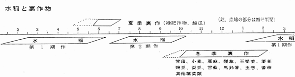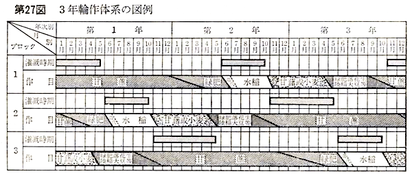 三年輪灌只是為了離水圳較遠的農田所設。近大圳的農田每年都可以得到灌溉水,因此一年可以種兩次水稻,一期稻與二期稻之間還可以種一季短期的夏季裡作,如越瓜或綠肥;二期稻與一期稻之間可種生長期略長的冬季理作,包括小麥、、亞麻、菸草、蕎麥、豌豆、蠶豆、甘藍、馬鈴薯、玉蔥、番茄與其他葉菜類作物等;一年四作,複作指數高可達4.0。